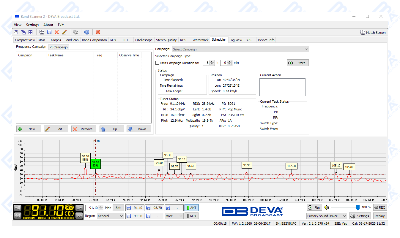 The free-of-charge Windows software sweeps the receiver across the FM band and generates a spectrum display of carrier level versus frequency. Each carrier is analyzed and a station list is created. This sophisticated product further refines stations with an RDS presence to show all radio data groups transmitted. It allows for manual tuning through the receiver screen or by double-clicking a point on the spectrum plot or an entry on the station list. There are two ways to save spectrum plots - as jpeg or bmp files. A separate window on the receiver screen displays the RDS data error level. With the Band Scanner 2 you can also view playlists of the competitive stations, as well as save and export them into and Excel file.