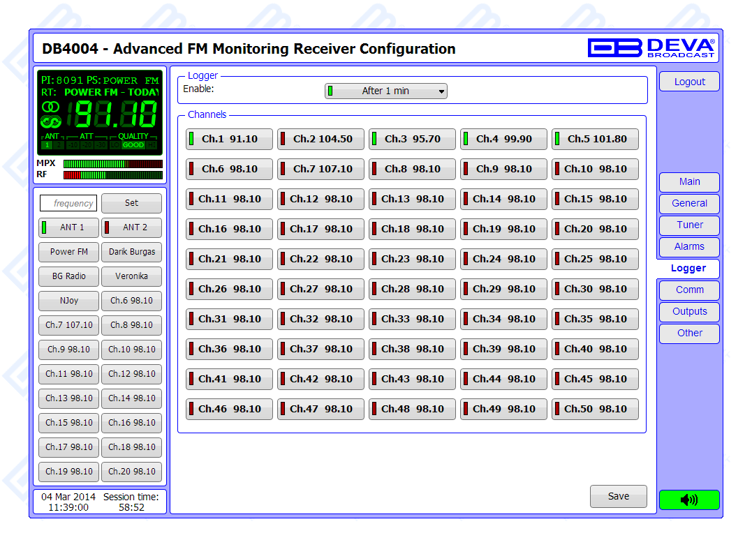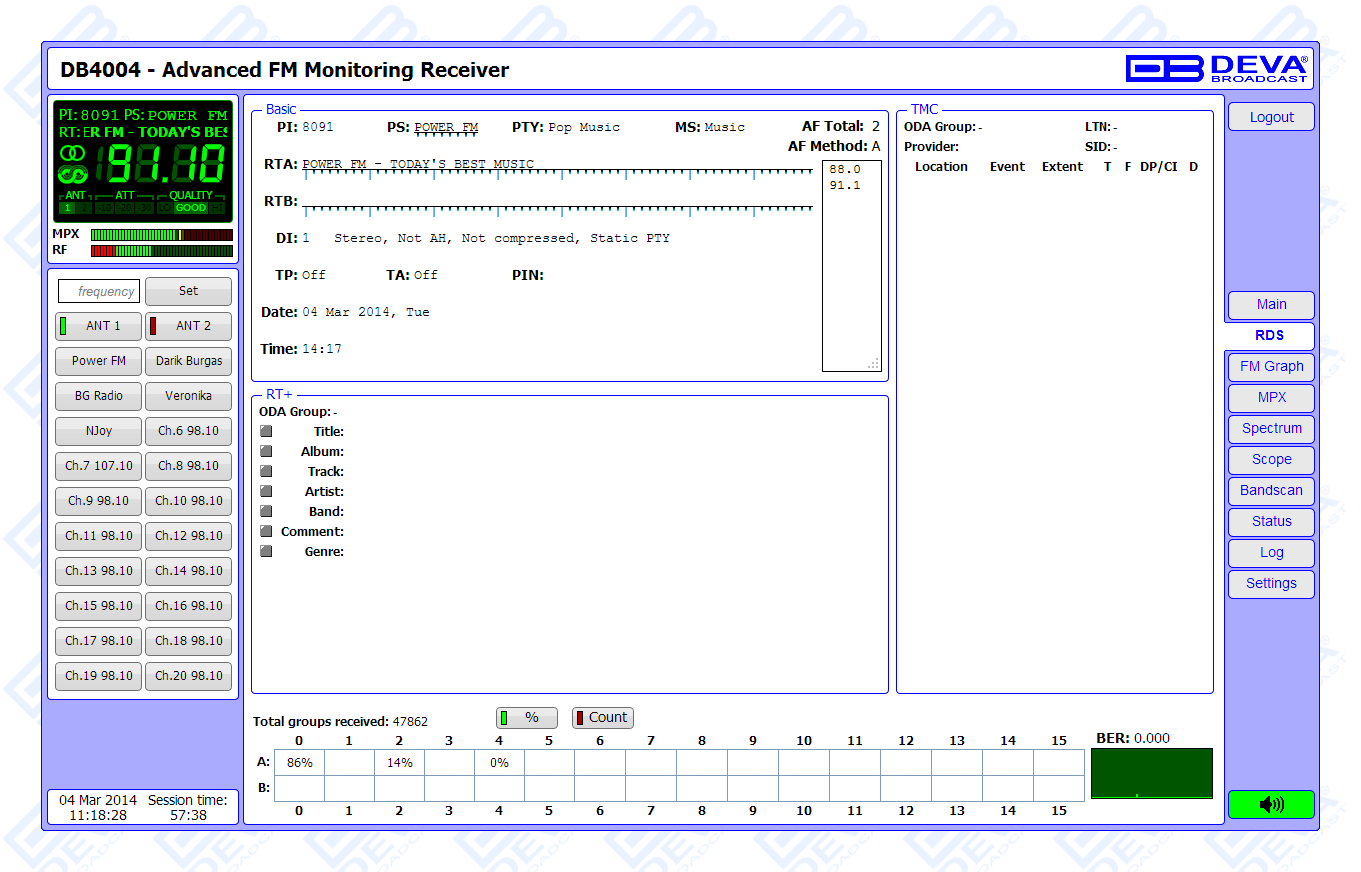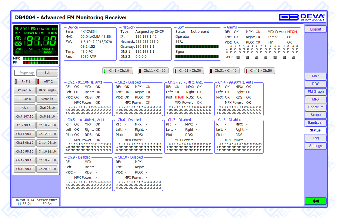 All the channel measurements and logs are saved on internal device memory. The built-in FTP system manages the files by an assigned schedule. All the collected information is centralized in a database and can be revised, played back, and sent automatically to the qualified staff if need be. The Interactive Software-based Log Viewer tool allows very detailed control and analysis of any station from the list of the monitored channels. The Band Analyzer function of the DB4004 presents an overview of all FM signals available, plus the RF signal strength of these stations. Scans are possible within any section of the band in the FM band in 3 different modes. The generated spectrum diagram shows the RF Level vs. the Frequency. Scheduled Band Scans can also be enabled for RF intruder or pirate transmissions detection. The DEVA Broadcast’s DB4004 is a superb monitoring system designed as a powerful tool for FM Radio signal analysis and regular off-air monitoring of your stations.