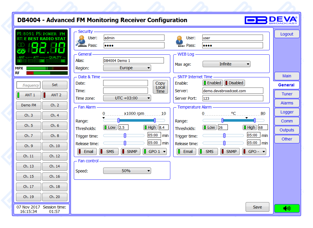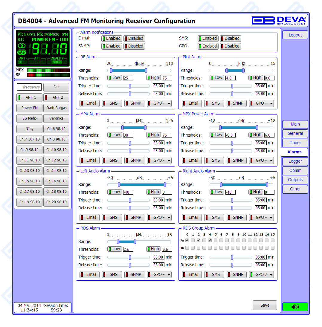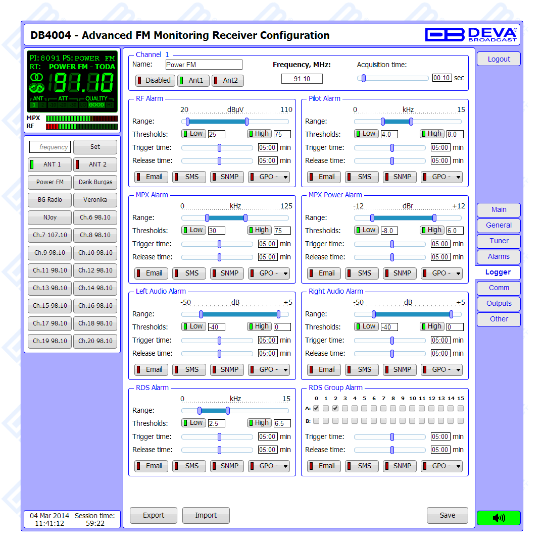 All the channel measurements and logs are saved on internal device memory. The built-in FTP system manages the files by an assigned schedule. All the collected information is centralized in a database and can be revised, played back, and sent automatically to the qualified staff if need be. The Interactive Software-based Log Viewer tool allows very detailed control and analysis of any station from the list of the monitored channels. The Band Analyzer function of the DB4004 presents an overview of all FM signals available, plus the RF signal strength of these stations. Scans are possible within any section of the band in the FM band in 3 different modes. The generated spectrum diagram shows the RF Level vs. the Frequency. Scheduled Band Scans can also be enabled for RF intruder or pirate transmissions detection. The DEVA Broadcast’s DB4004 is a superb monitoring system designed as a powerful tool for FM Radio signal analysis and regular off-air monitoring of your stations.
