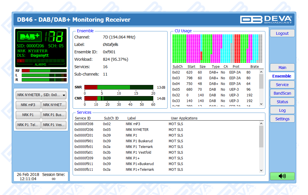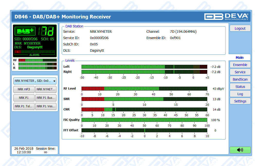 Continuing a tradition for products brought about by creative thinking and technological precision, the DB46 - Compact DAB/DAB+ Monitoring Receiver slots in seamlessly within DEVA’s range of monitoring tools by offering another dimension of accuracy and cost-effectiveness. While also retaining the defining characteristics of the DEVA brand, this revolutionary product is specifically dedicated to one of the major areas in the industry - Digital Audio Broadcasting, and fully meets the ETSI EN 300 401 DAB standard.