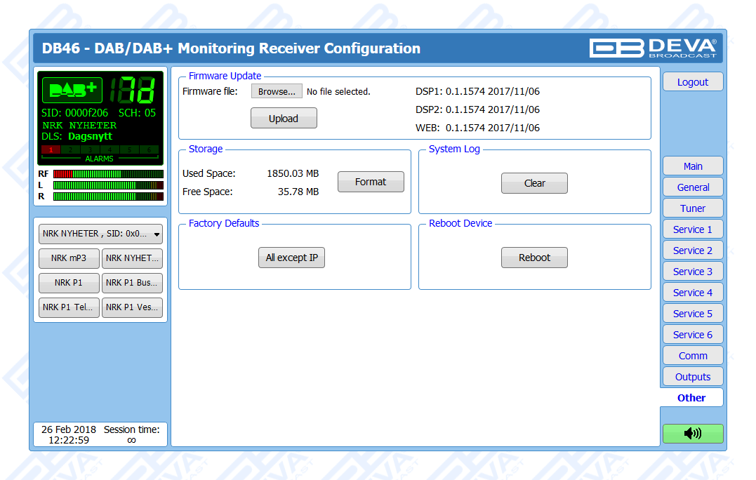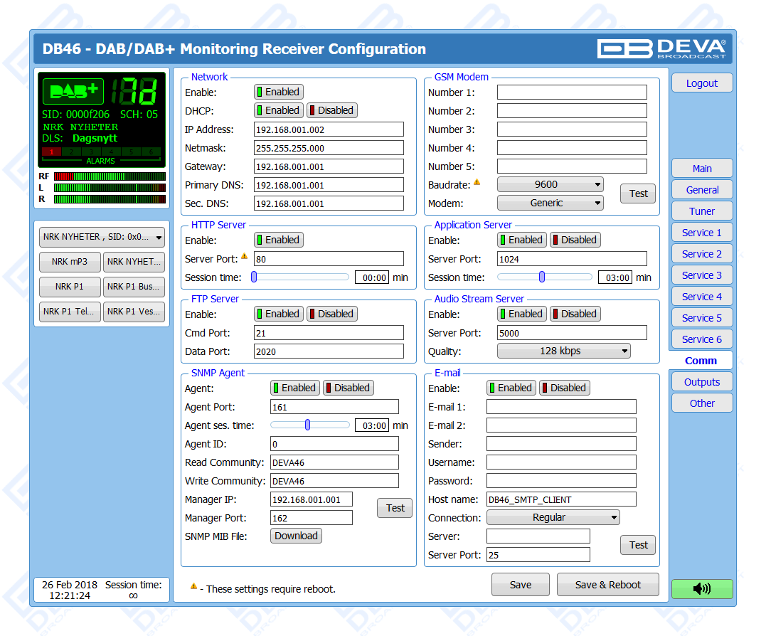 Another impressive feature of the DB46 is the fact that the tool guarantees no interruption of the broadcast signal. This is achieved through the provided local alarm options and online notifications via rear-panel alarm GPOs, E-mail and SNMP in case there is audio loss or change in the DAB signal and the Left and Right Audio Levels. This allows for a fast response on the part of the maintenance staff so that prolonged signal loss can be prevented.
