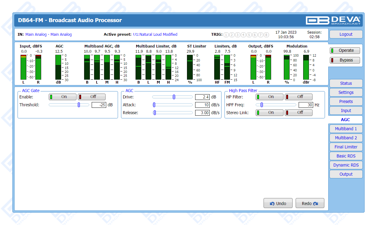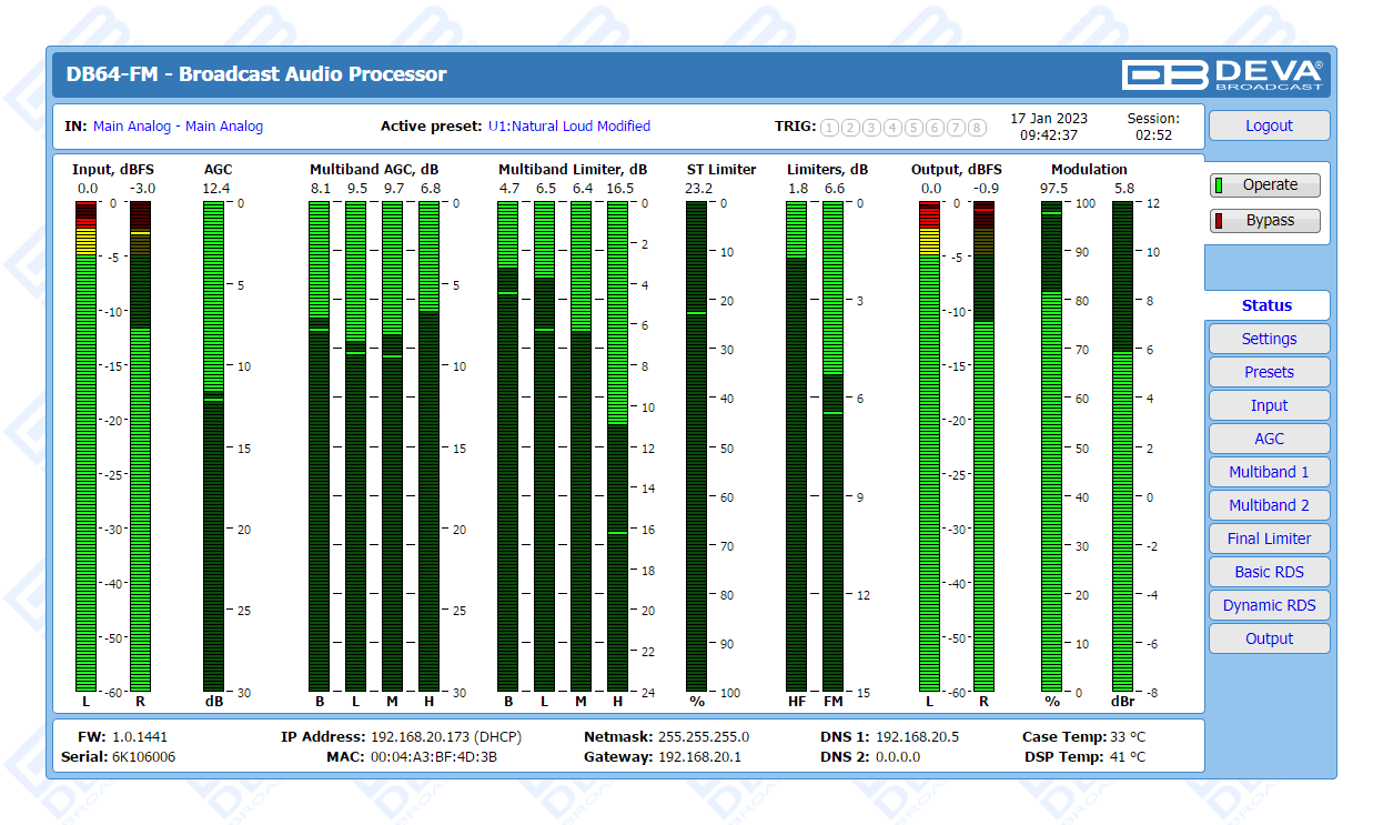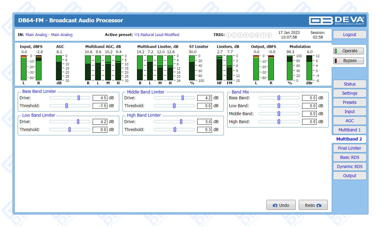 The DB64-FM is the ultimate audio processing solution offered by DEVA bringing to you unheard-of balance between quality and price. It guarantees perfect clarity of sound and a multitude of features that are unrivalled in its class. In keeping with the other members of DEVA’s audio processors family, this device is an outstanding blend between dependability and functionality. The all-digital DSP-based design, the 4-band processor and the advanced wide band AGC are just a few of the parameters that ensure its top performance.