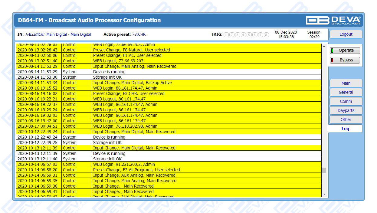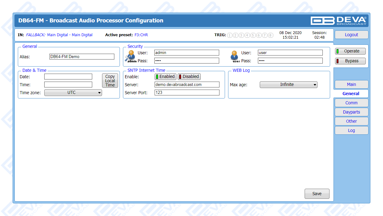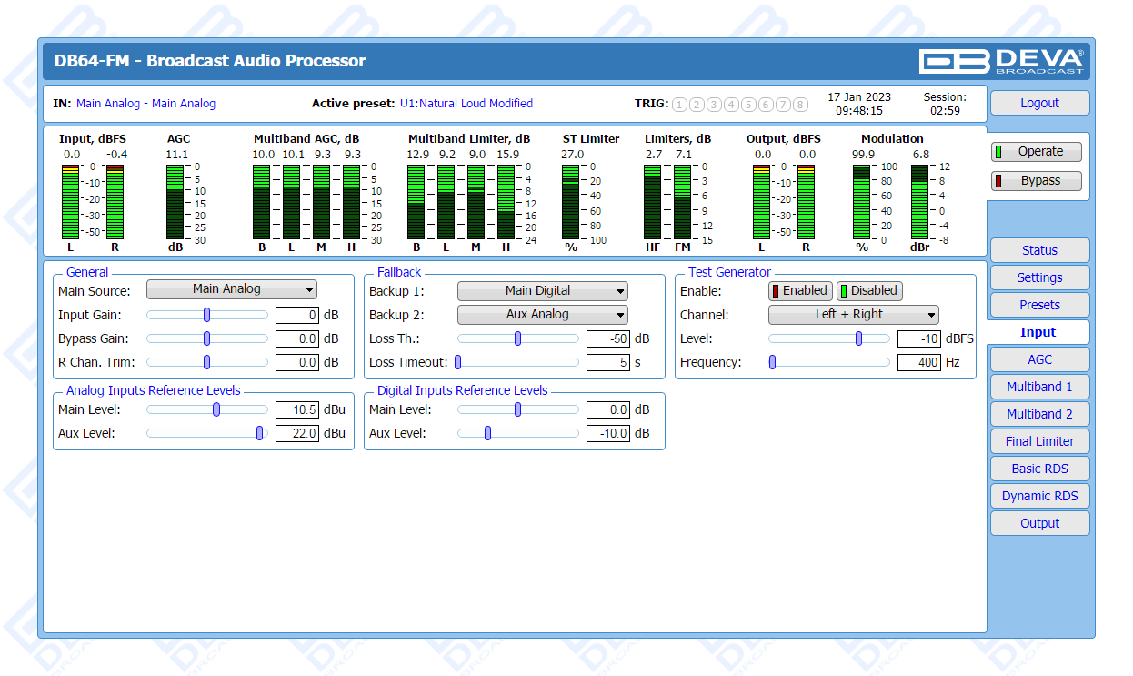 As part of its long and well-established tradition of occupying just the right market niches and supplying the broadcasting world with products that stand out as the best answer to customer needs, DEVA is yet again delivering a tool of undisputed quality and surpassing even its own high standards. A device appropriate for all LPFMs and featuring a 4-band processor with Fidelity and Sound Impact System, the DB64-FM makes no compromises with sound quality. Among its wide variety of features are the FM controlled distortion limiter, the analog and digital audio outputs, two independent composite MPX outputs, as well as its ability to detect signal loss and switch over to a backup source. Automatic notifications are sent upon input or preset change via email or SNMP.