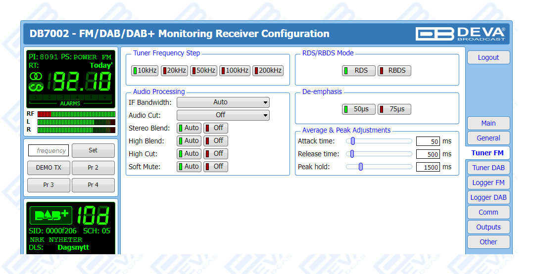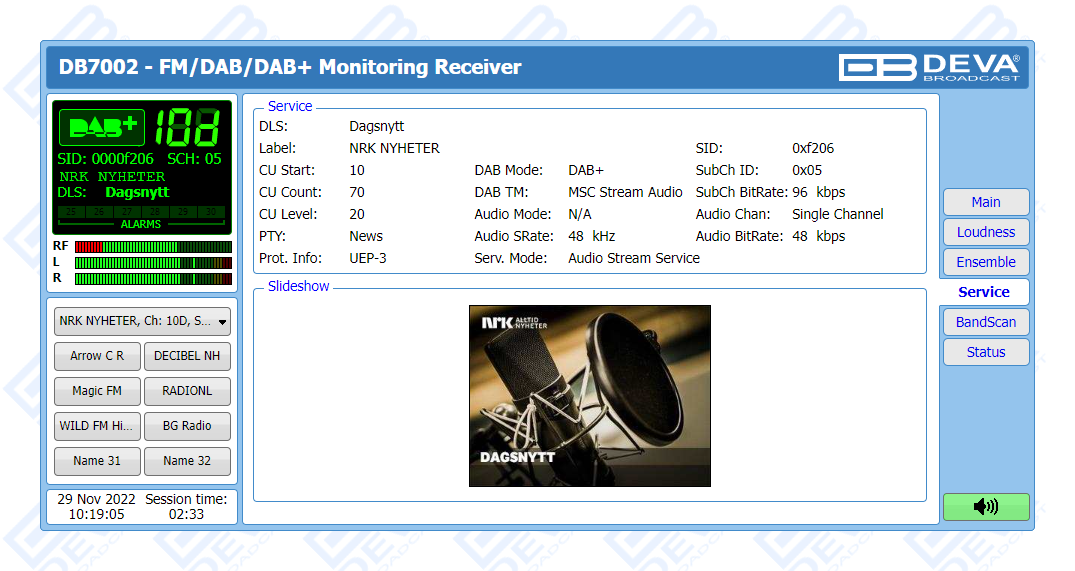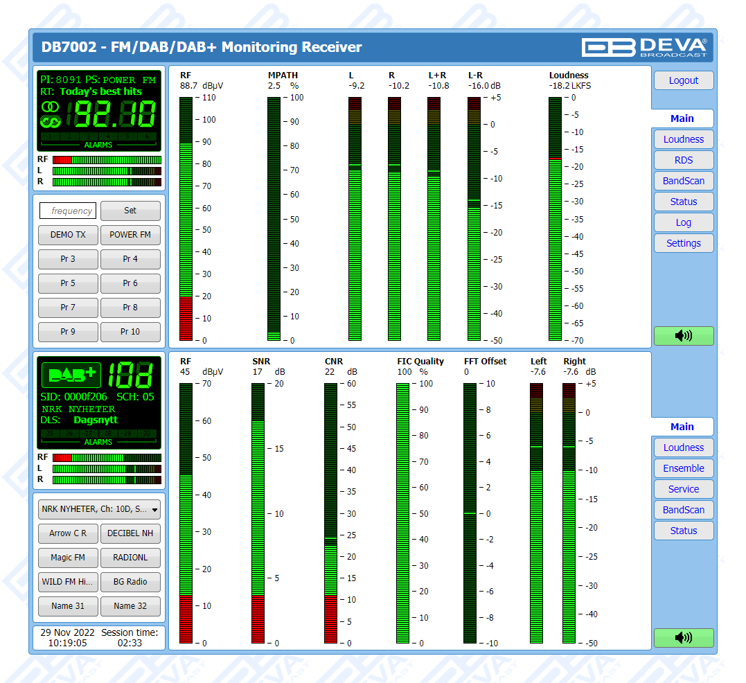 As an FM monitoring tool, DB7002 also provides powerful signal processing capabilities through sophisticated DSP algorithms and offers a Loudness Meter, which allows for measurements to be shown as defined by ITU BS.1770-4 and EBU R128 recommendations.