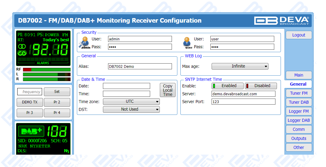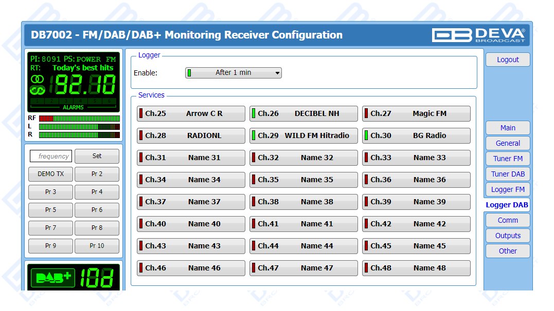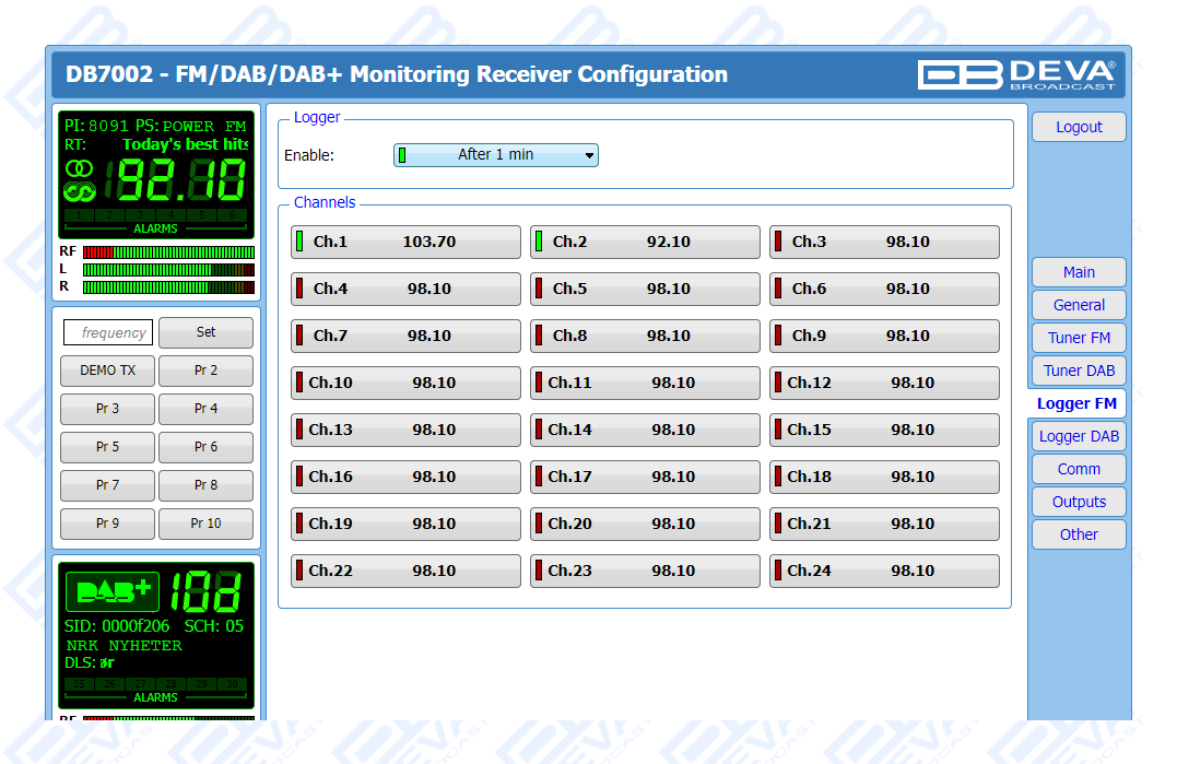 DB7002 is a revolutionary solution that combines in a single, high-precision tool the most important functionalities of two separate types of product. To achieve that, our engineers have equipped this model with two independent tuners - one for FM and one for DAB/DAB+, allowing for the device to perform both FM and DAB/DAB+ monitoring in parallel. It provides detailed and accurate measurement of all of the most important signal parameters and also boasts two loggers with 24 channels apiece for FM and DAB/DAB+. The recorded information is stored in log files on an SD card for easy future analysis and can easily be downloaded via a standard FTP client.