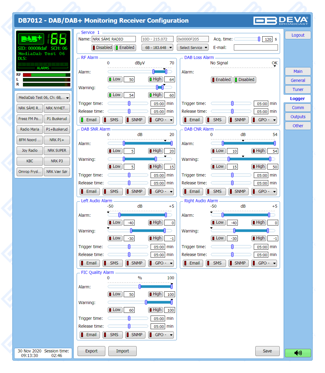 As a leading manufacturer of advanced broadcasting technology, it is DEVA’s aim to constantly supply top-of-the-range gear in keeping with the major industry trends, which is why our team has created a top-quality line of products dedicated to Digital Radio Broadcasting. As part of that line, the DB7012 fully meets the ETSI EN 300 401 DAB standard. Additionally, it offers support for Program Associated Data (PAD), as well as all standard bitrates and VBR and automatically displays live metadata. While the signal is being monitored and logged, the DB7012 measures the following DAB signals: RSSI, SNR, CNR, FIC Quality, FIB Errors, FFT Offset and the Left & Right Audio level values and stores them, thereby allowing for future analysis. The collected data can easily be downloaded via a standard FTP client. As an additional feature, the tool guarantees that there is no interruption of the broadcast signal. This is achieved through the provided local alarm options and online notifications via rear-panel alarm GPOs, E-mail and SNMP in case there is audio loss or change in the DAB signal and the Left and Right Audio Levels. Therefore, maintenance staff can be quick to respond and prevent prolonged signal loss.