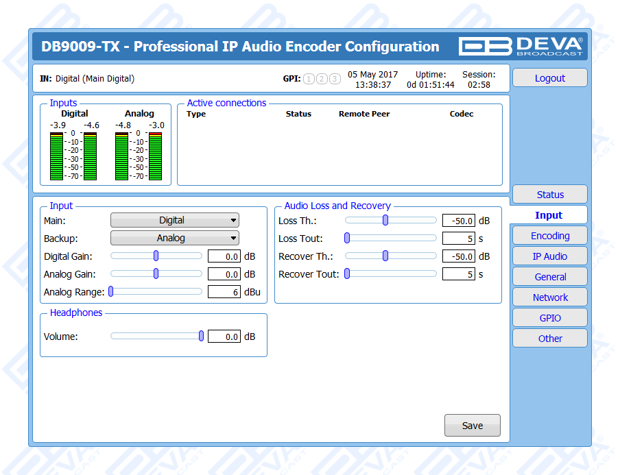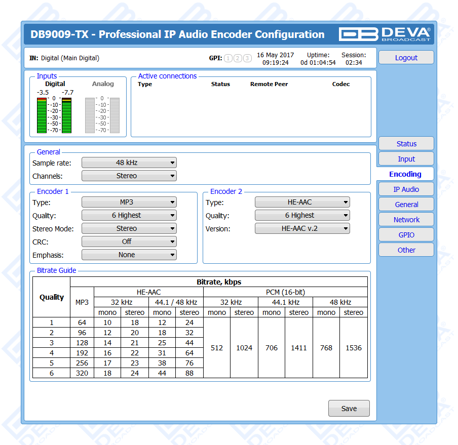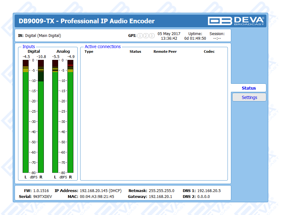 Since DEVA’s products are manufactured to meet the highest standards, the encoding of the audio sources into high quality configurable format, is made in real time by HE-AAC Versions 1 and 2 or MPEG-1 Layer 3. This in combination with the lossless uncompressed PCM stream, unaffected by the variable network conditions, guarantees long distance audio transmission without quality loss.
