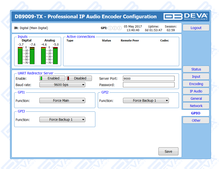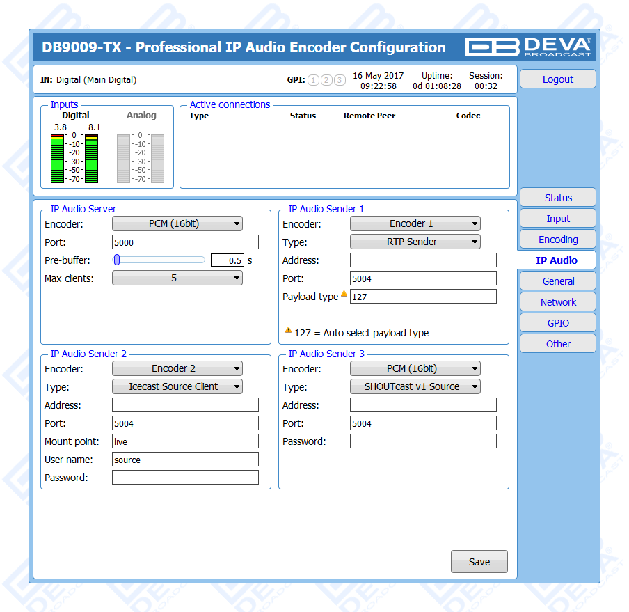 Upon selecting the audio source, the encoded in real time audio will be instantly send to the network. The new and improved DB9009-TX can act simultaneously as an Icecast compatible Server, Icecast source client or Real Time Protocol (RTP) sender. Through the RS-232 port, this device could be easily transformed from an Ethernet to a serial Redirector, enabling quick integration of the existing audio systems to the Internet.