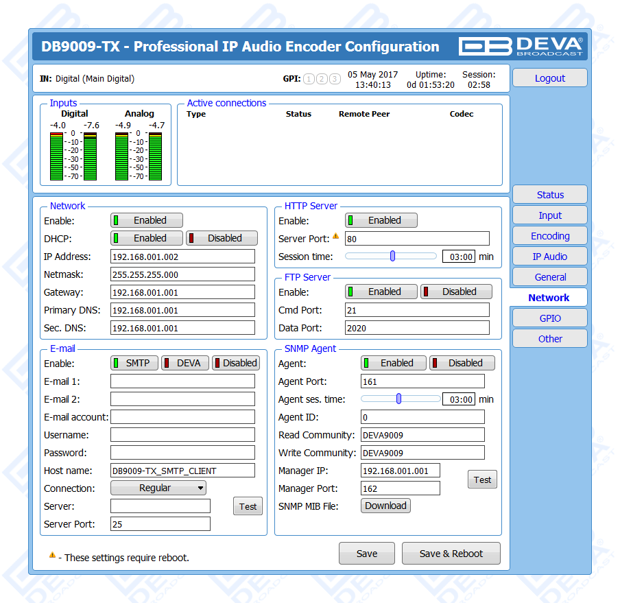 DB9009-TX is a second generation multi protocol Audio over IP Encoder, designed in line with the latest market requirements. Designed to be user friendly in terms of operation, this device is perfect for both inexperienced and professional broadcasters alike. DB9009-TX can work with either analog or digital audio signal. The compressed output signal is directly transmitted over the IP-based networks to one or more compatible IP Audio players or decoders.