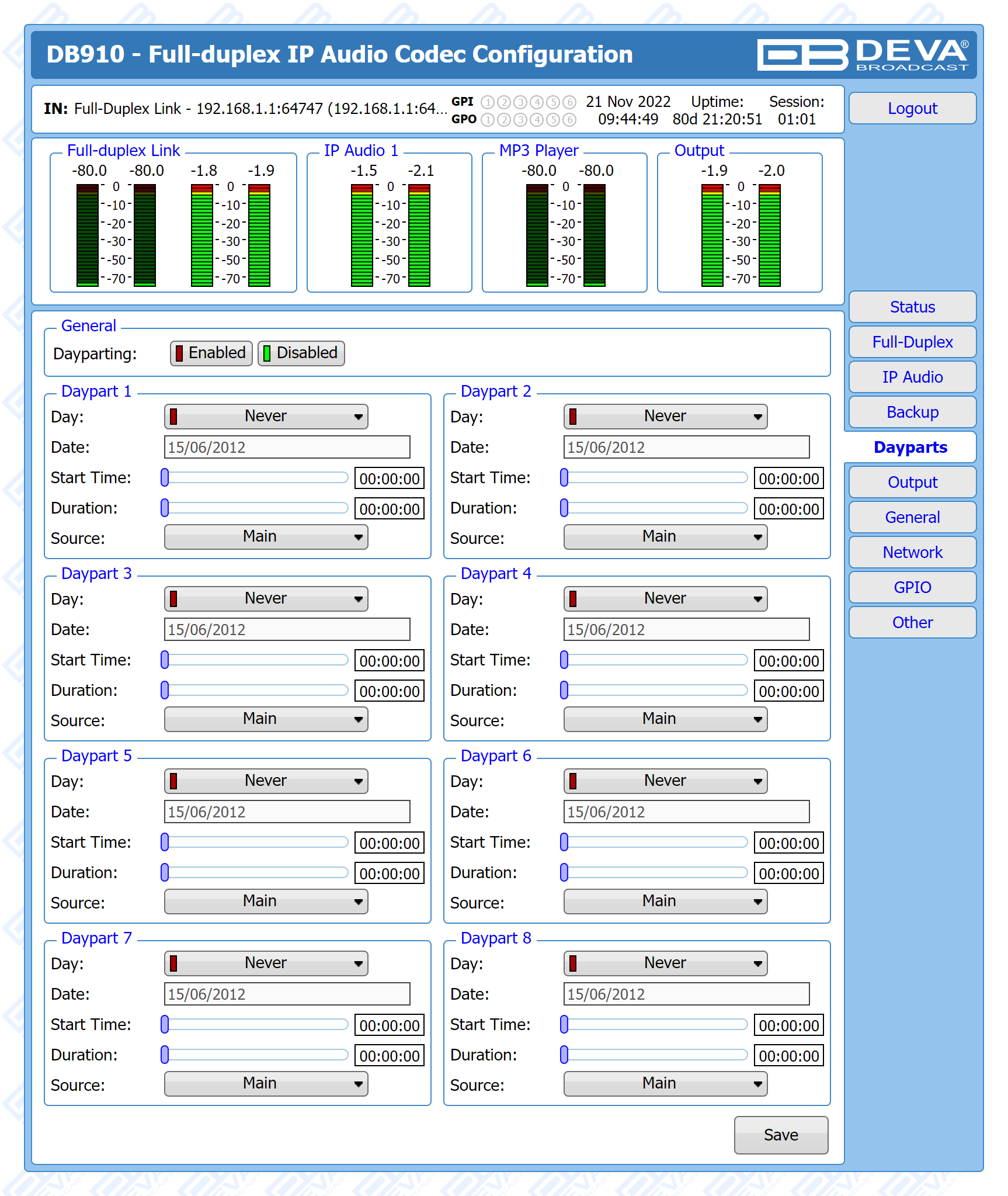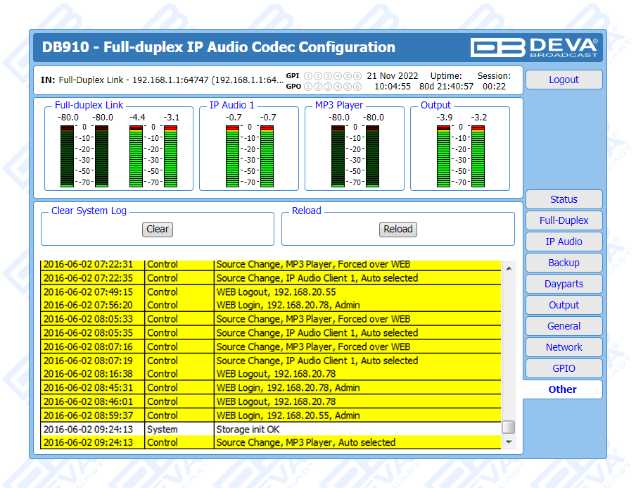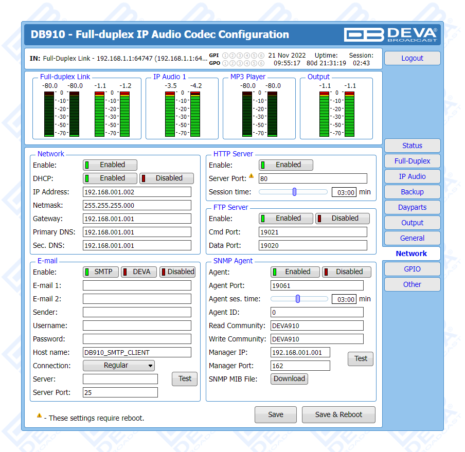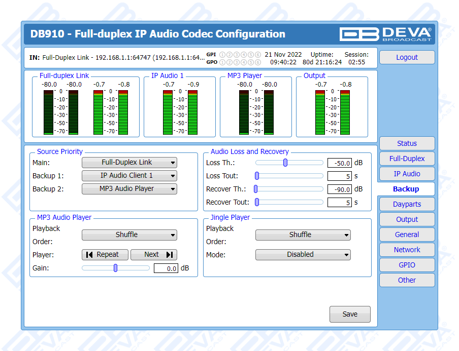 Apart from its main audio source, DB910 supports several IP audio sources and a built-in MP3 Backup Audio Player in addition. With several backup audio sources incorporated, the DB910 will immediately switch between the sources when the audio is lost, and return to the main one when the audio is restored, with no user intervention. The audio content for the MP3 player is recorded on the internal SD card. The backup files can be managed remotely through the built-in FTP Server, via standard FTP client.
