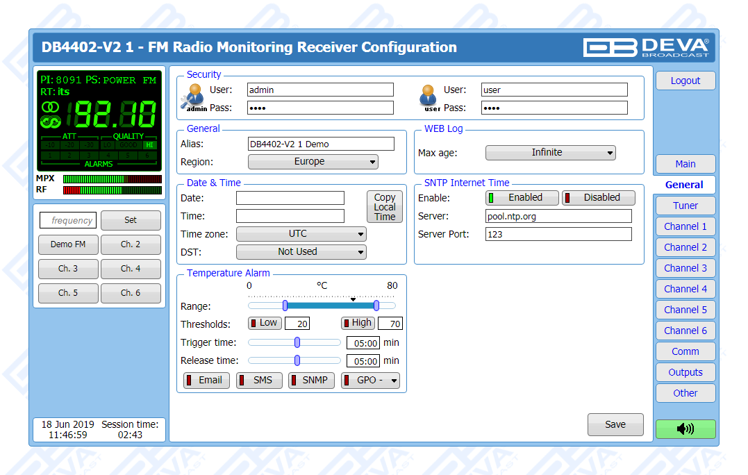 Providing the stable, dependable operation characterizing all DEVA products, the DB4402-V2 is fully DSP-based, with a built-in oscilloscope and an RDS/RBDS decoder with a BER meter. It also permits users to set alarms for RF, MPX, Pilot and RDS signal via email, SMS or SNMP. What is more, the TCP/IP and GSM connectivity provides easy remote control, monitoring and listening to the radio signal from any location.