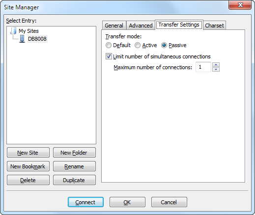 In some cases, FileZilla's "Quick connect" feature is not able to connect with DB8008. That is why we recommend the device to be assigned in the program manually.