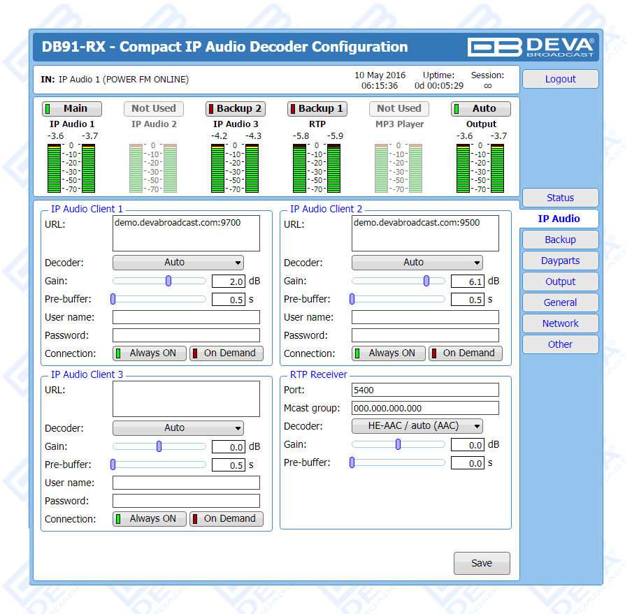 The DB91-RX is not only compatible with many online radio systems, Icecast and SHOUTcast included, but also supports low latency Real Time Protocol (RTP) connection. Controlled through a simple and intuitive HTML 5 based WEB Interface, the device can be used for Broadcast, Internet Radio, Studio to Transmitter Link, as well as VoIP applications. The DB91-RX IP audio decoder could be also set to work as a multicast RTP receiver, which makes it a particularly valuable asset when delivering audio to multicast groups.