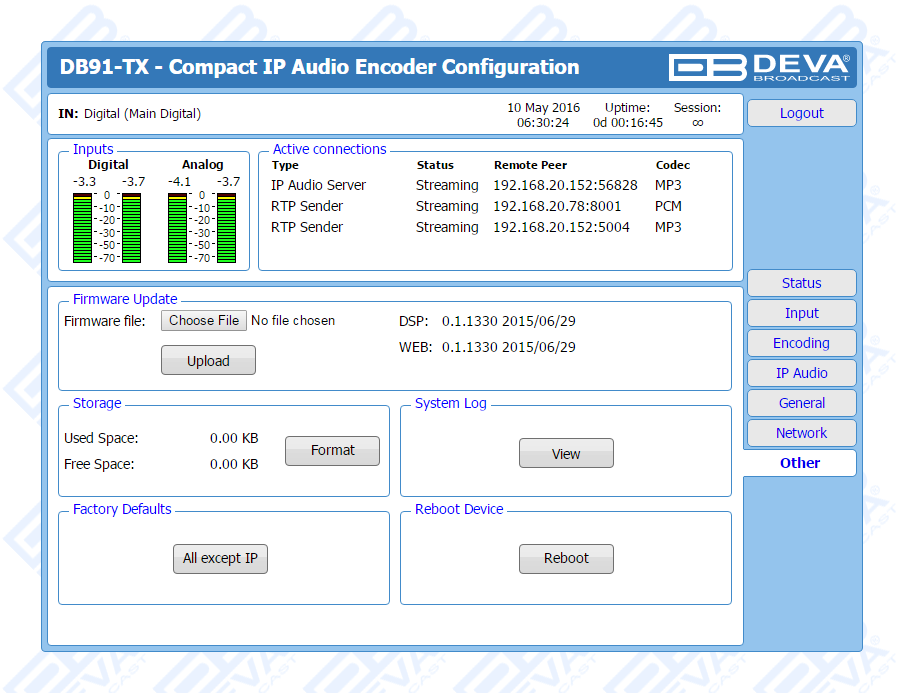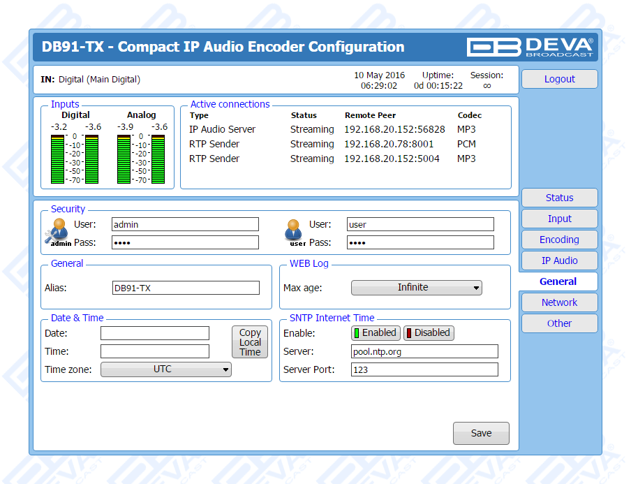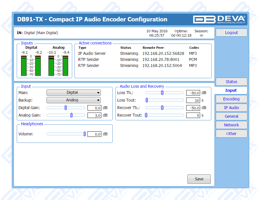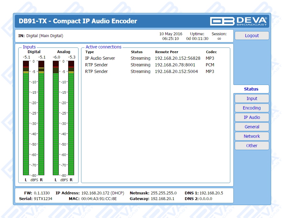 To unit ensures premium broadcasting experience as once the audio source is selected, the encoded in real time audio is immediately transmitted over IP-based networks. The enhanced DB91-TX can act simultaneously as an Icecast/Shoutcast compatible Server, Icecast source client or Real Time Protocol (RTP) sender. The audio stream can be spread over an IP-based network to one or more DB90-RX, DB91-RX or other compatible IP audio decoders. To address the evolving customer needs, the DB91-TX IP Audio Encoder can also send audio to a number of clients simultaneously, provided that a multicast address is being entered as a client address.