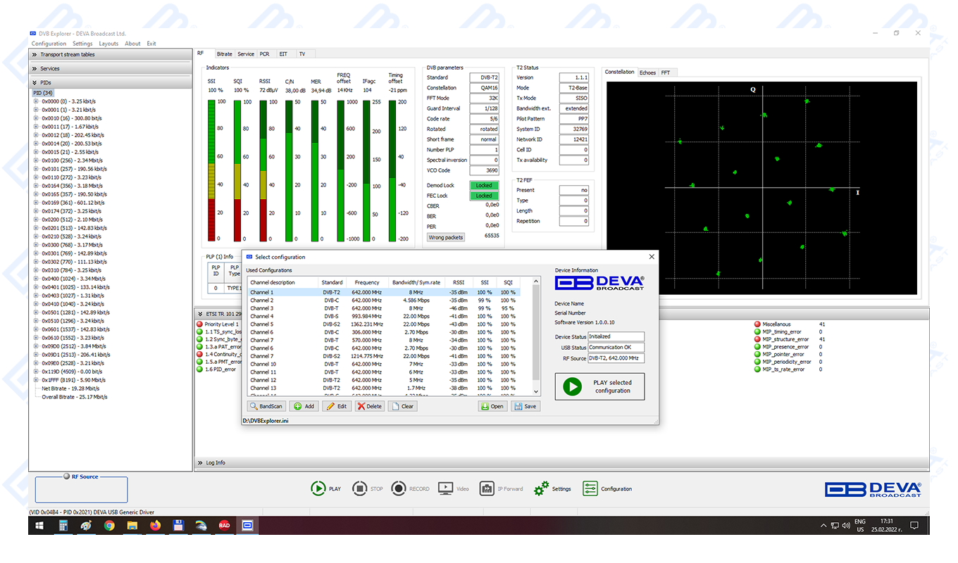 The device supports all modulation schemes from QPSK to 64QAM for DVB-T, QPS to 256QAM for DVB-T2, QAMQPSK to 32APSK for DVB-S/S2 and from 16QAM to 256QAM for DVB-C. File-based offline analysis is provided as well. The product offers an audio/video player supporting H.265/HEVC, H.264/MPEG-4 AVC, MPEG-1/2, AAC, MP3, etc. It also provides multistream support for DVB-S2, as well as support for DVB-T, DVB-T/T2 & T2 Lite.