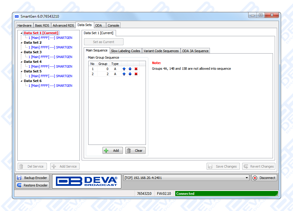 NexGen is software fully compatible with several devices from DEVA wide range RDS/RBDS product line. In order for the correct settings to the encoder and software to be applied, kindly refer to the RCS NexGen and Prophet settings for SmartGen RDS/RBDS Encoders document which can be found in the download section.