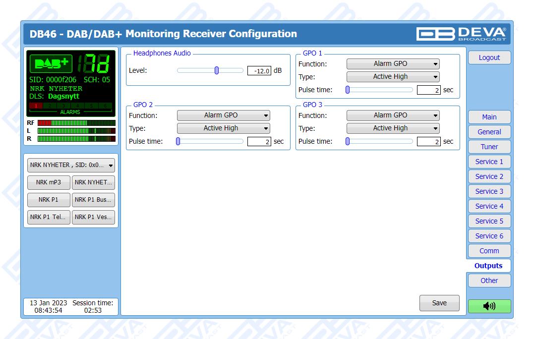 Another impressive feature of the DB46 is the fact that the tool guarantees no interruption of the broadcast signal. This is achieved through the provided local alarm options and online notifications via rear-panel alarm GPOs, E-mail and SNMP in case there is audio loss or change in the DAB signal and the Left and Right Audio Levels. This allows for a fast response on the part of the maintenance staff so that prolonged signal loss can be prevented.