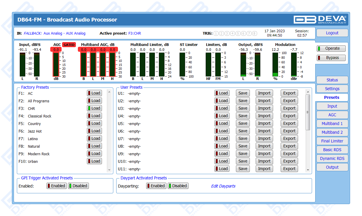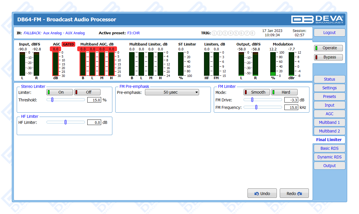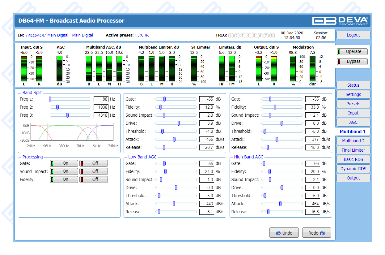 The DB64-FM is the ultimate audio processing solution offered by DEVA bringing to you unheard-of balance between quality and price. It guarantees perfect clarity of sound and a multitude of features that are unrivalled in its class. In keeping with the other members of DEVA’s audio processors family, this device is an outstanding blend between dependability and functionality. The all-digital DSP-based design, the 4-band processor and the advanced wide band AGC are just a few of the parameters that ensure its top performance.