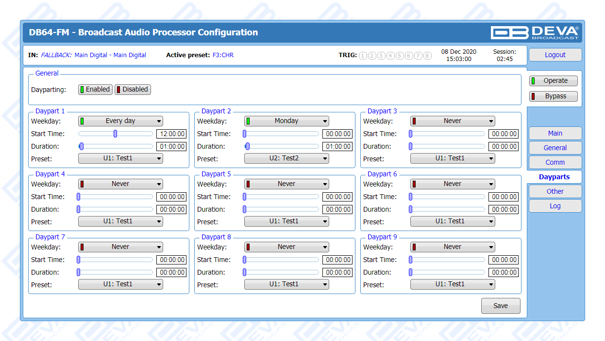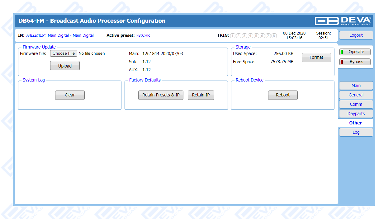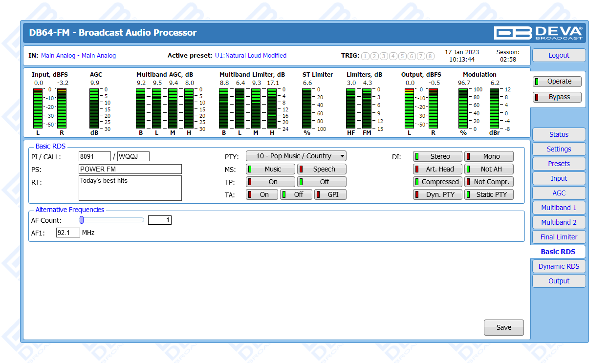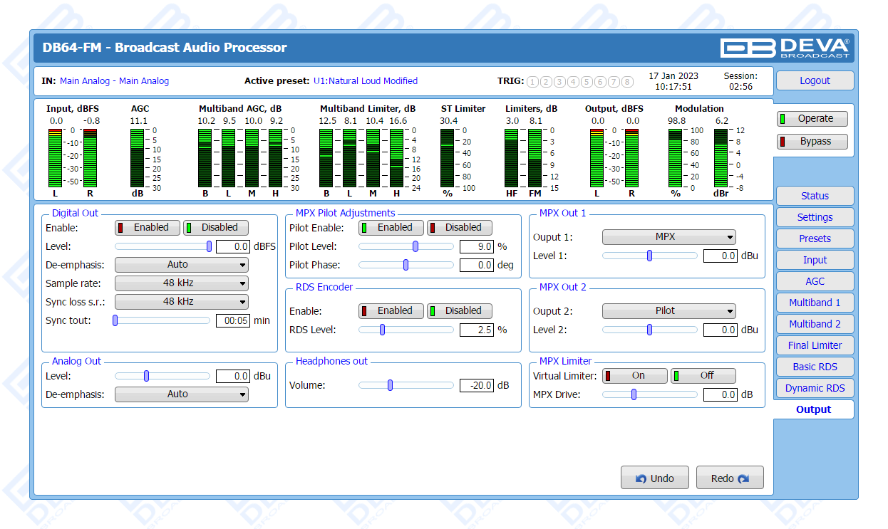 The DB64-FM is the ultimate audio processing solution offered by DEVA bringing to you unheard-of balance between quality and price. It guarantees perfect clarity of sound and a multitude of features that are unrivalled in its class. In keeping with the other members of DEVA’s audio processors family, this device is an outstanding blend between dependability and functionality. The all-digital DSP-based design, the 4-band processor and the advanced wide band AGC are just a few of the parameters that ensure its top performance.