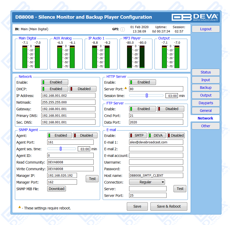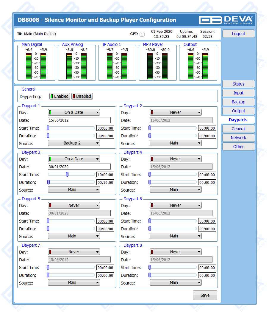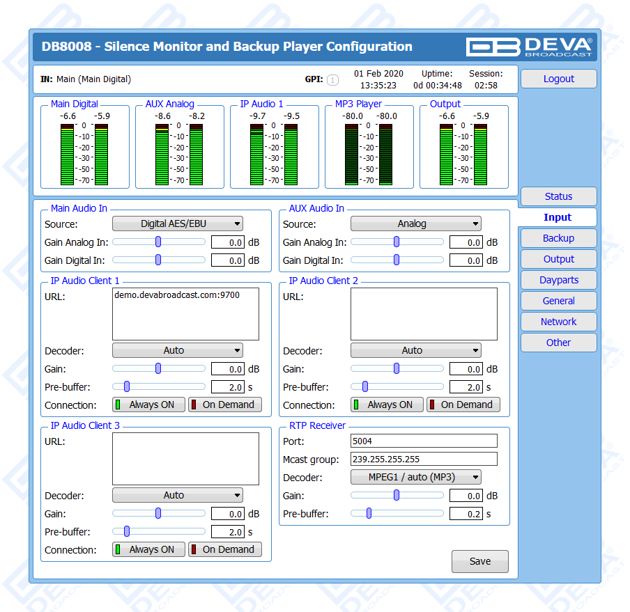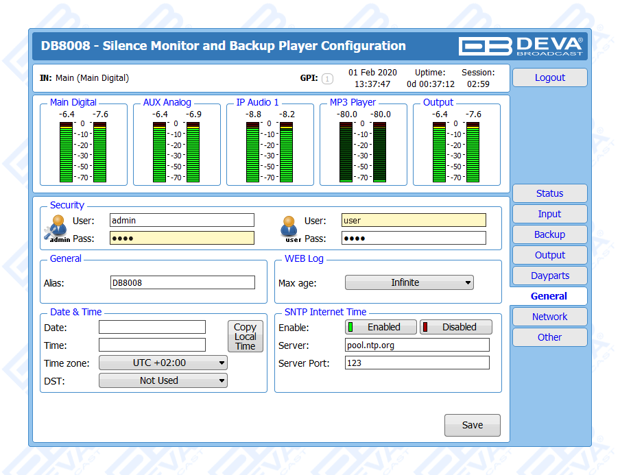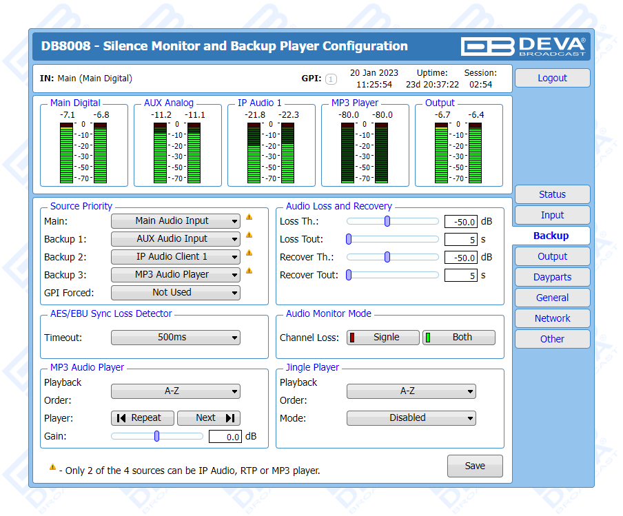 DB8008 has a built-in backup audio player. It plays tracks from SD Card storage uploaded over the FTP, in case of main audio signal loss.