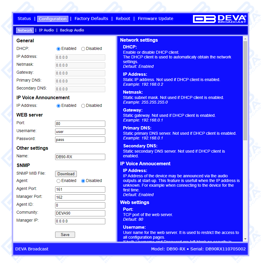 - The DB9000-RX/DB90-RX should have a static IP Address. If the device is placed behind a router, you will have to make sure that the Icecast Player server port is properly NAT forwarded;