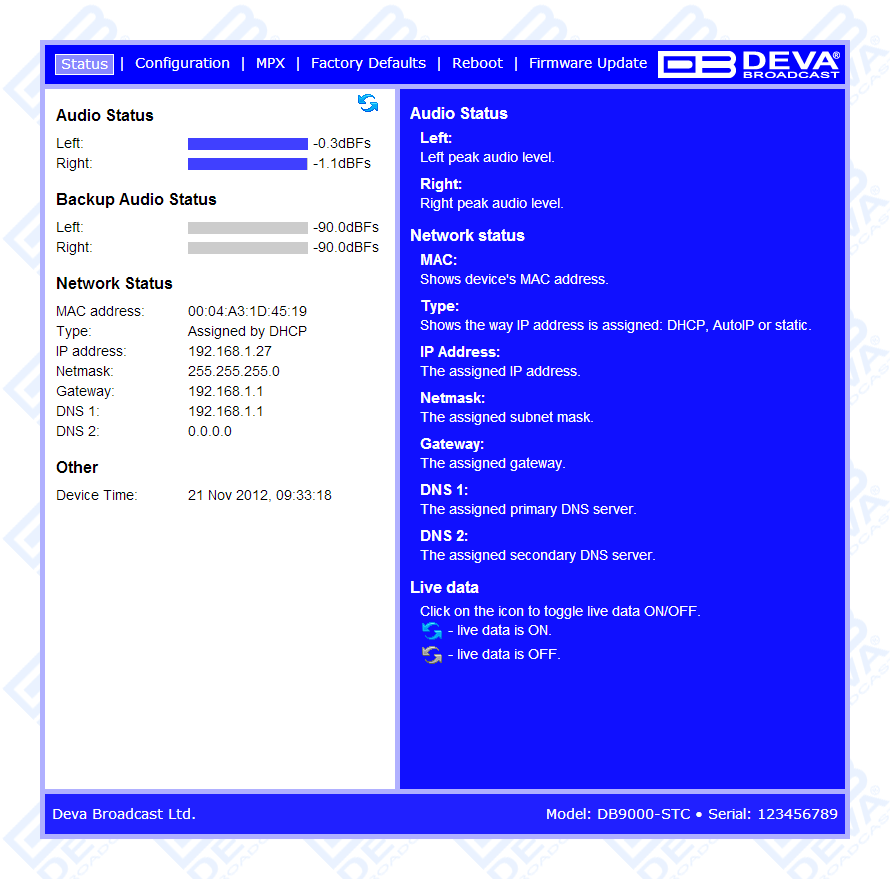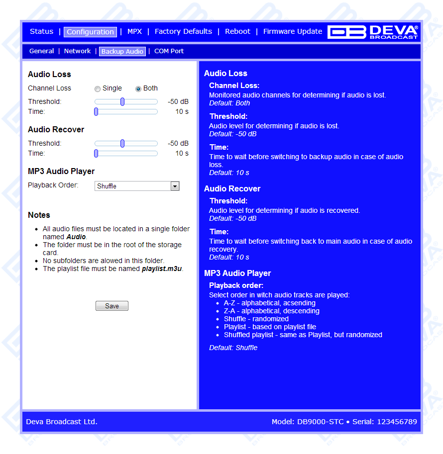 Another impressive feature of the DB9000-STC is that it can fight the dreaded dead air problem. The DB9000-STC provides additional uncompromising security in case of loss of audio at the audio inputs. The audio backup is presented as an integrated built-in MP3 audio player. The basic principle of operation is that this unit can detect the silence and switch the output to the alternative MP3 Player. The MP3's backup audio files and play lists can be uploaded in the device from your PC using any FTP client. The audio storage capacity of DB9000-STC is 2 Giga Bytes.