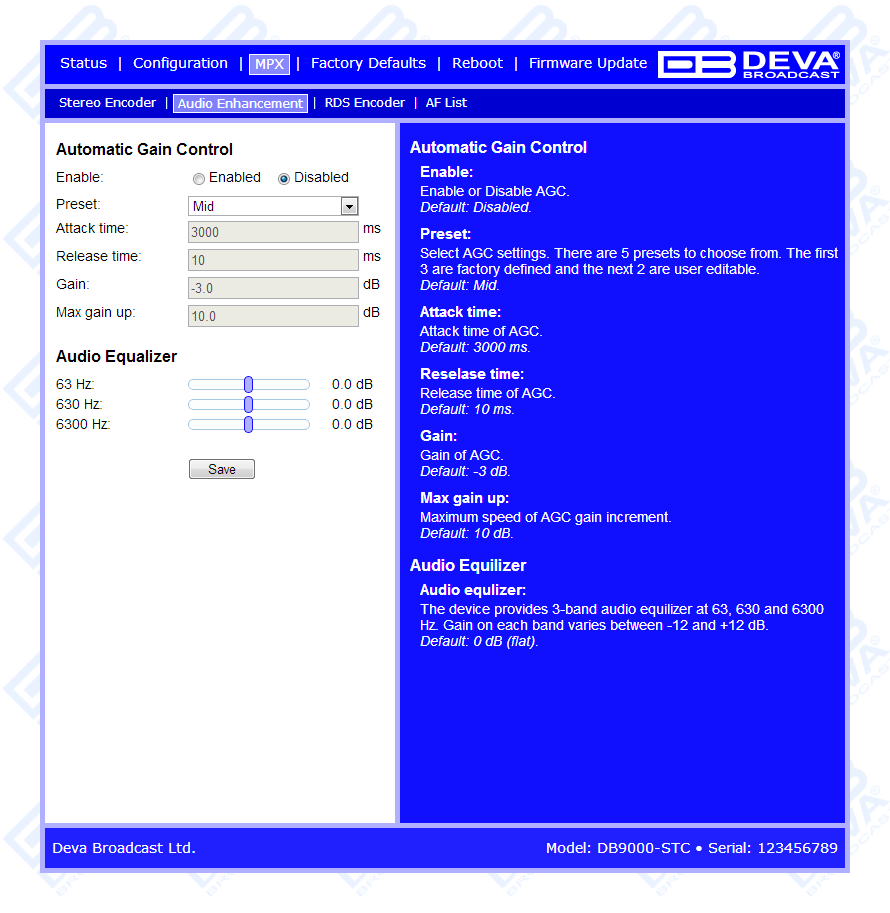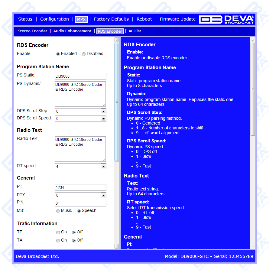 DB9000-STC is controlled trough a build in WEB Server and a standard web browser can be used to monitor its status or to make some adjustments. Once you have accessed the WEB Interface, in order for the needed AF adjustments to be made, go to MPX section, then select AF List subsection and set a number of alternative frequencies. Then, if for example you have specified 3 AFs, the 4th AF should be set as disabled. The disabled AF is considered as the end of the list and AFs after it will not be transmitted. Please note that If AF 1 is "Disabled" the list will NOT be transmitted.