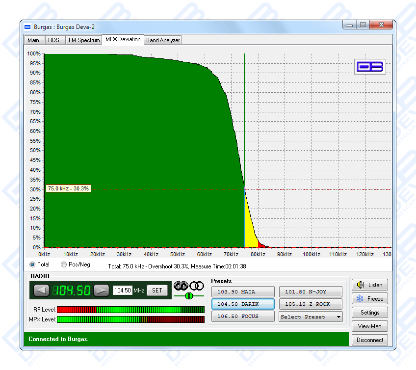 DB4000’s Server System is the best solution for the management of multi-site remote DB4000 devices. It is a server-based system that can manage alarms, measurements and data from the field units. The controlling software offers a very intuitive interface to create schedules for full control of a single or a number of monitored radio stations. The Band Analyzer function presents an overview of all the FM parameters together with the RF signal strength of the station. The Band Scanning is possible within FM band limits. The generated spectrum diagram shows the RF Level vs. the Frequency.