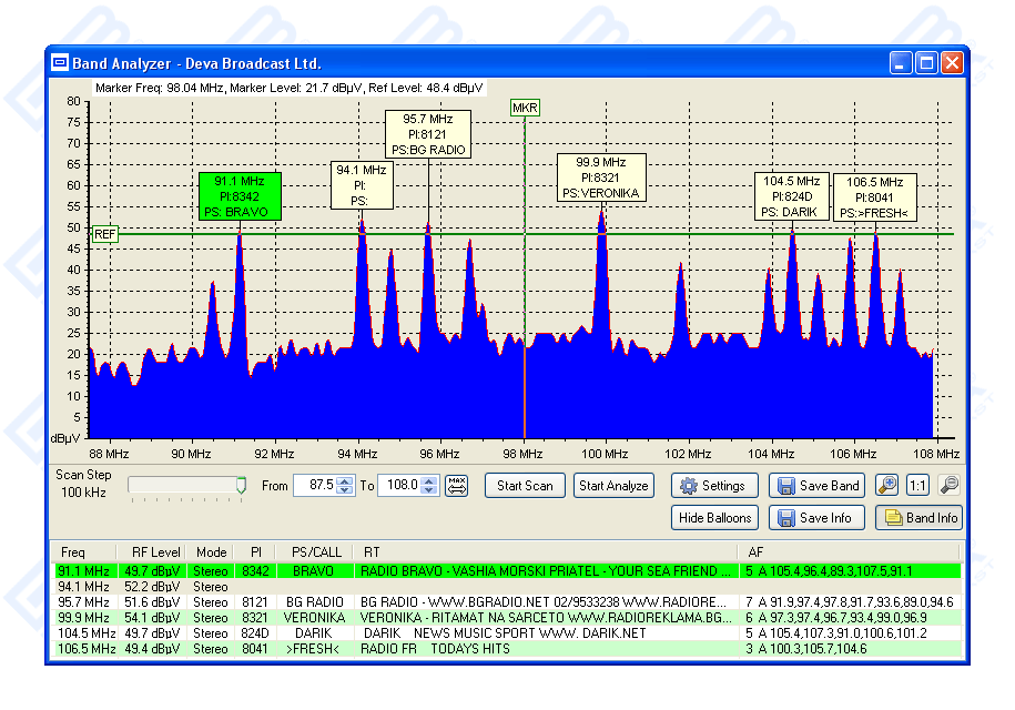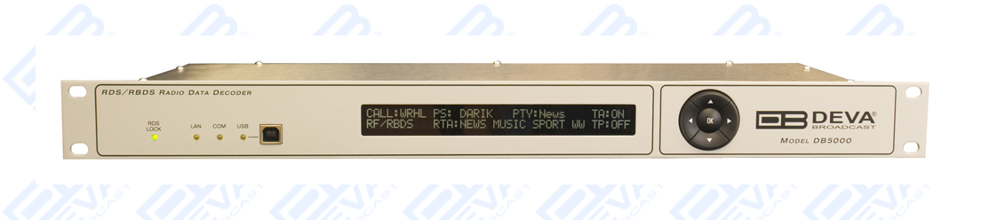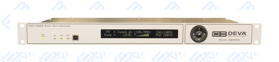 The DB5000 recovers the additional inaudible RDS information which is transmitted by FM radio broadcasting stations and operates in accordance with all the European RDS and The American RBDS standards and specifications. The device is made up of two sections: Purely digital RDS demodulator module with cascaded antialiasing and 8th order bandpass filter for precise RDS band selection. The demodulating section performs the extraction of RDS data stream coming from the MPX composite and direct 57kHz input and built-in FM Stereo tuner module with own RDS/RBDS decoder for off-air reception. The DB5000 can be used as a very simple spectrum analyzer for remote investigation of the FM Band via Internet. The composite port is suitable for connection to any MPX output of any FM receiver or modulation monitor.