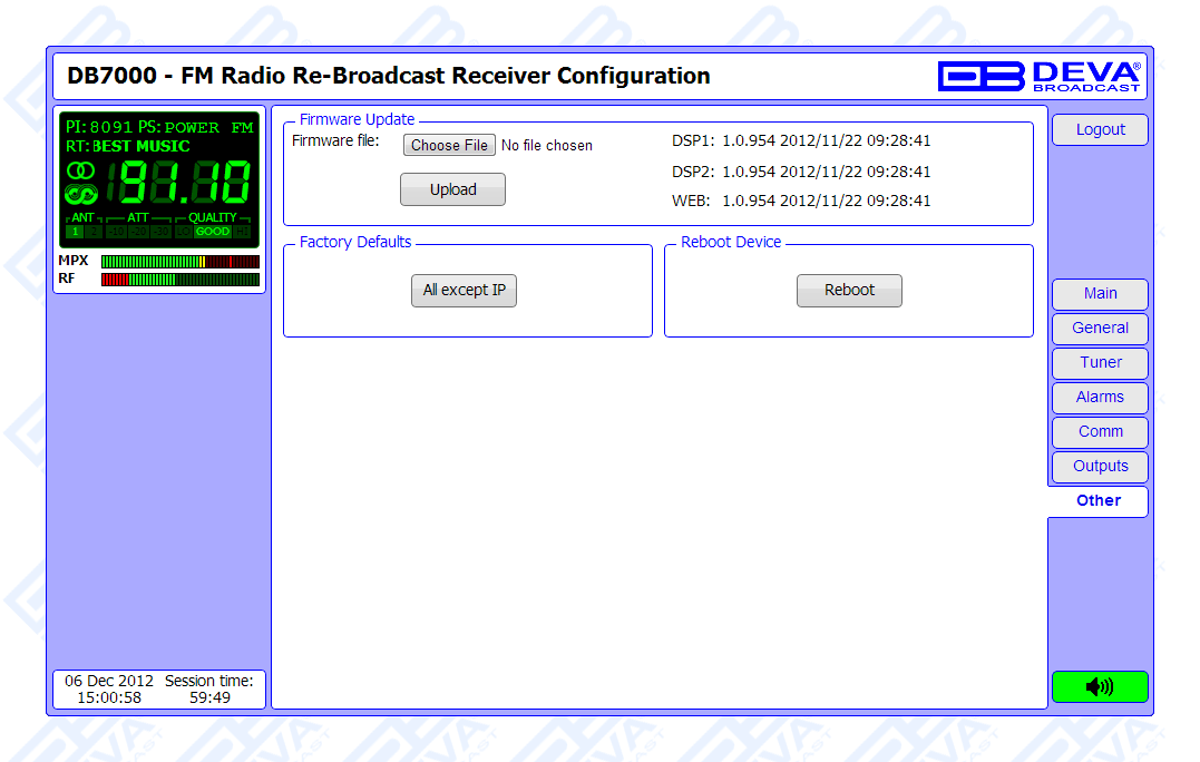 The Band Analyzer function of the DB7000 presents an overview of all FM signals available, plus the RF signal strength of these stations. Scans are possible within any section of the band in the FM band in 3 different modes. The generated spectrum diagram shows the RF Level vs. the Frequency. Scheduled Band Scans can also be enabled for RF intruder or pirate transmissions detection. In case of a transmission failure, maintenance staff will be immediately alerted via E-mail, SNMP, or SMS which signals the technicians to restore a normal service as soon as possible. A high performance level and sustained reliability make the DB7000 to satisfy the requirements of the most demanding broadcasters, as well as the satellite and cable operators. This product has been designed with the latest state-of-the-art audio technology in use, and with very low harmonic distortion!