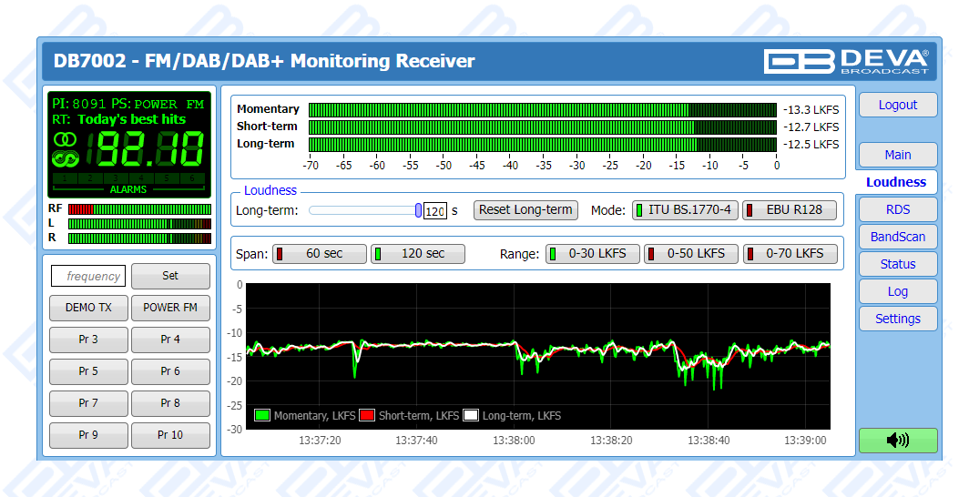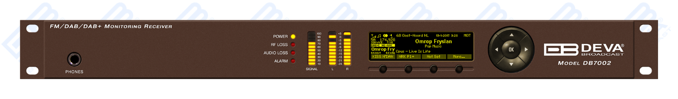 As an FM monitoring tool, DB7002 also provides powerful signal processing capabilities through sophisticated DSP algorithms and offers a Loudness Meter, which allows for measurements to be shown as defined by ITU BS.1770-4 and EBU R128 recommendations.