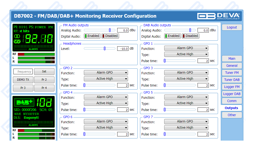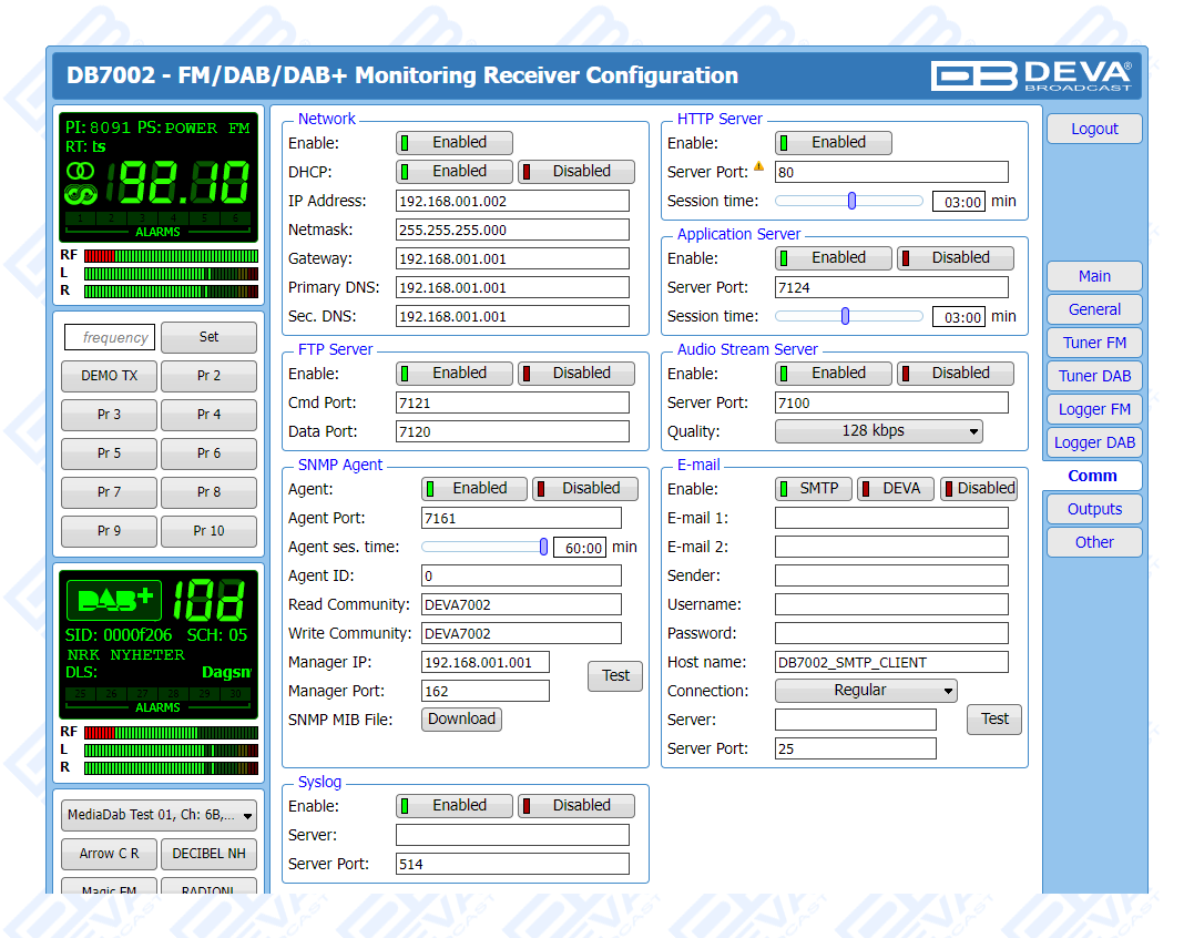 DB7002 is a revolutionary solution that combines in a single, high-precision tool the most important functionalities of two separate types of product. To achieve that, our engineers have equipped this model with two independent tuners - one for FM and one for DAB/DAB+, allowing for the device to perform both FM and DAB/DAB+ monitoring in parallel. It provides detailed and accurate measurement of all of the most important signal parameters and also boasts two loggers with 24 channels apiece for FM and DAB/DAB+. The recorded information is stored in log files on an SD card for easy future analysis and can easily be downloaded via a standard FTP client.