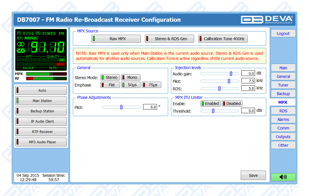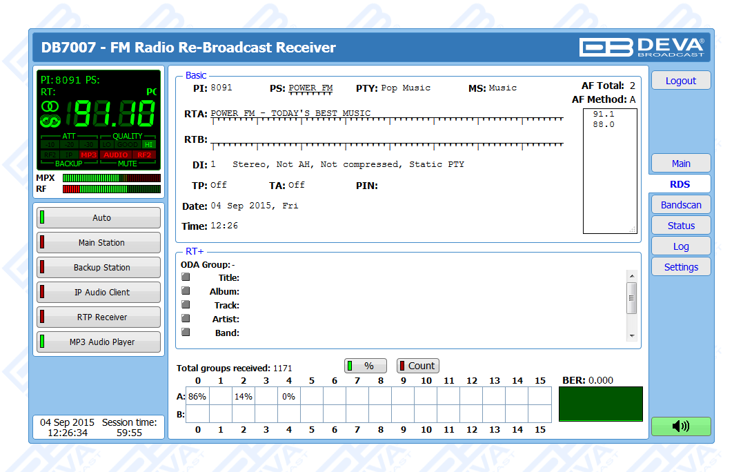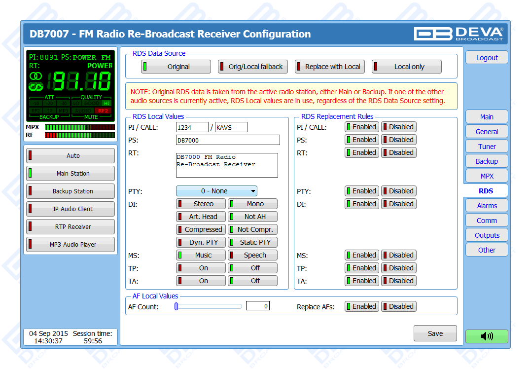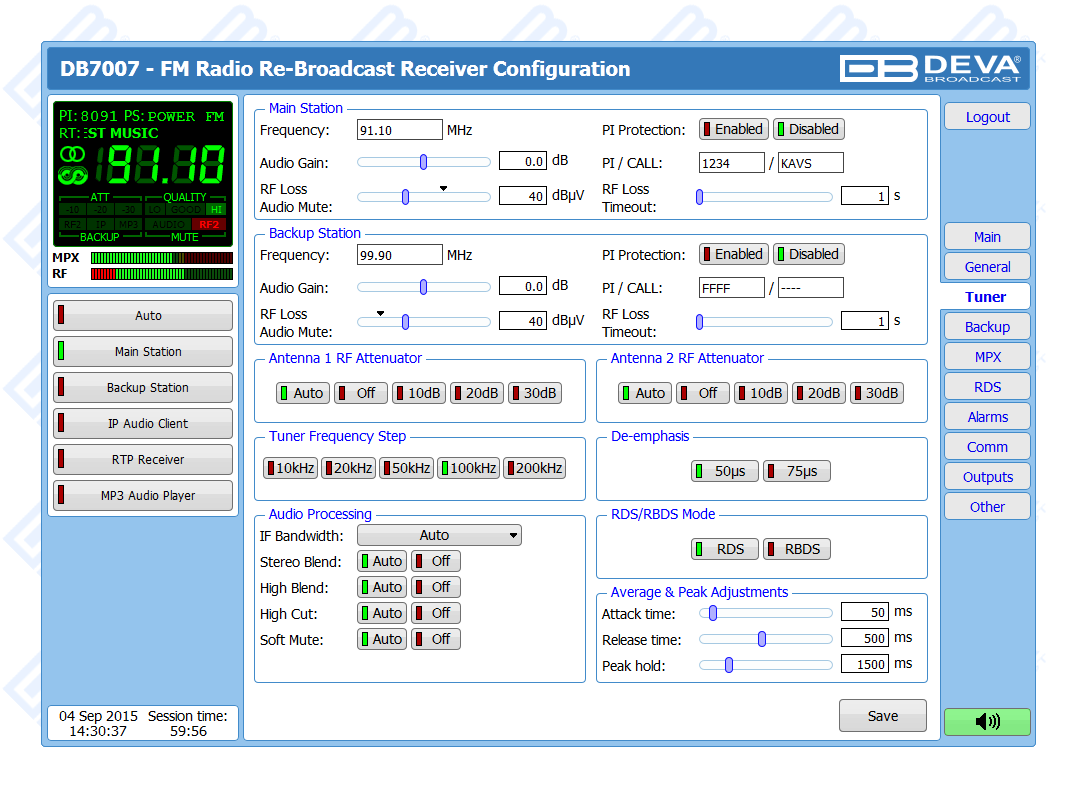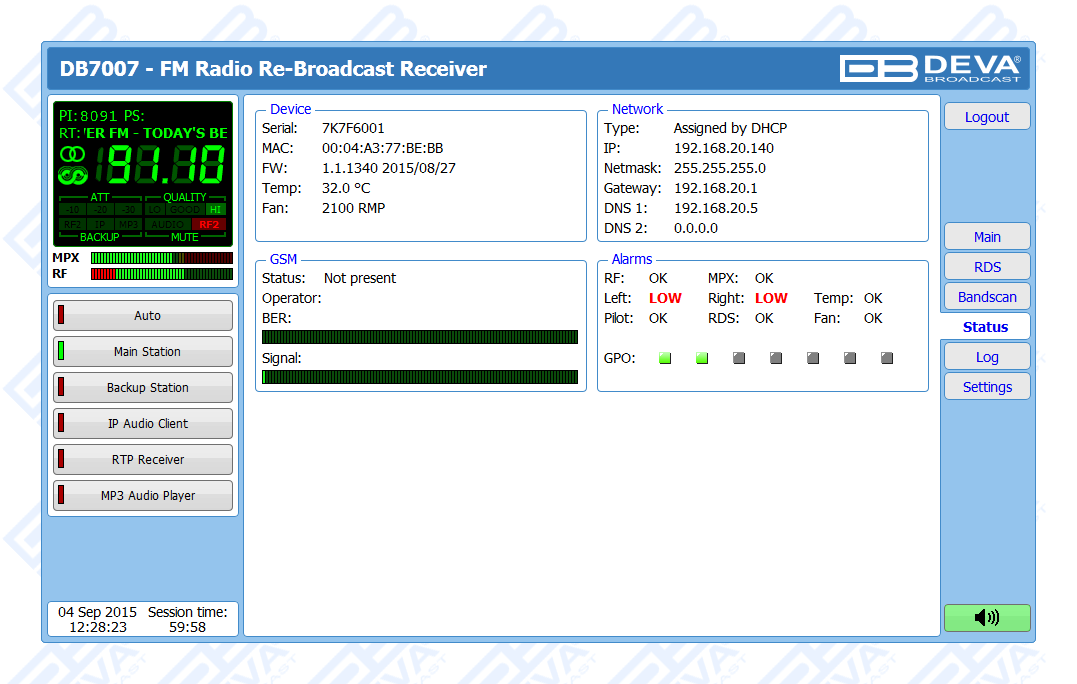 DB7007 is a second generation digitally-tuned FM Re-Broadcast Receiver. Considering the needs of the most demanding broadcasters and continuously supplementing new features to our devices, DEVA has enhanced DB7007 to be smarter and fully functional unit, equipped with two high-selective DSP-based FM tuners.
