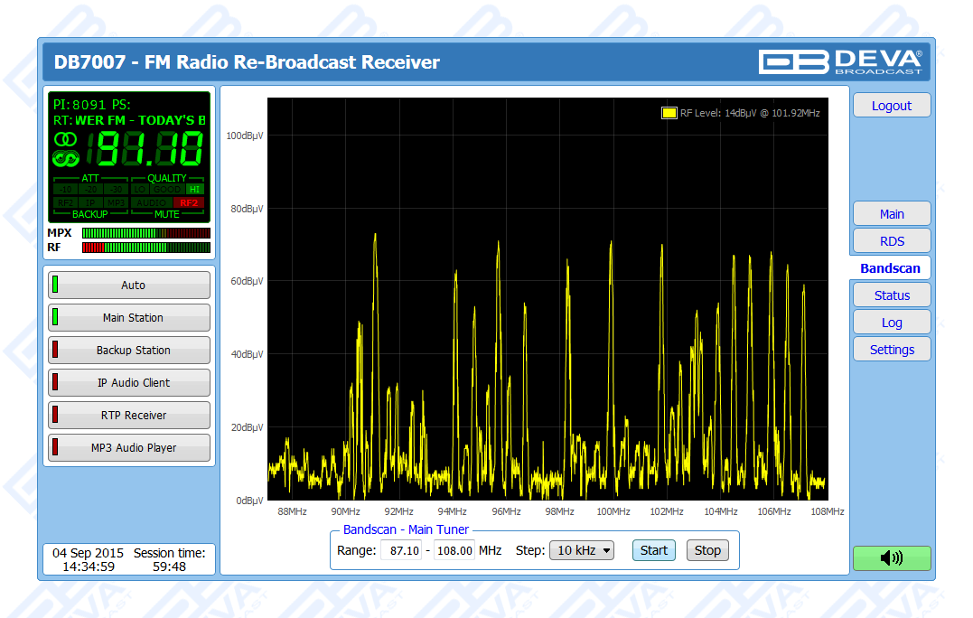 Additionally, the RDS information contained in the processed MPX signal is easily visualized and represented as RDS/RBDS Data and detailed RDS/RBDS Statistics. The utilized Band Analyzer function presents an overview of all available FM signals, plus the RF signal strength. Scans can be performed within any section of the FM band in 4 different frequency steps. The consequently generated spectrum diagram visualizes the relation RF Level vs. Frequency.