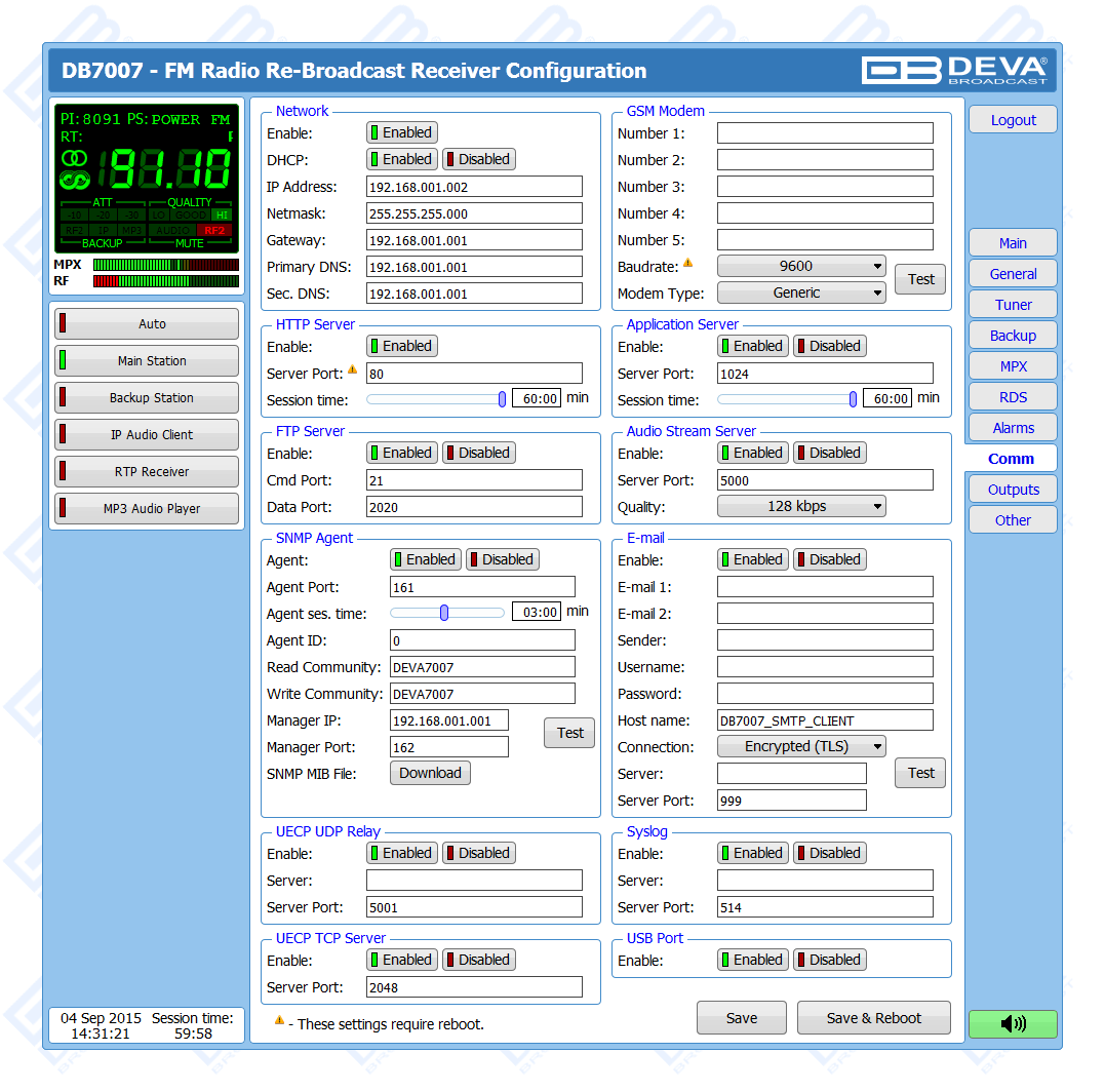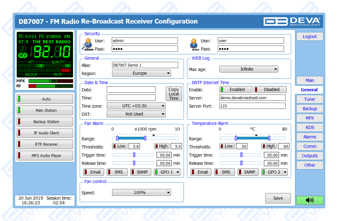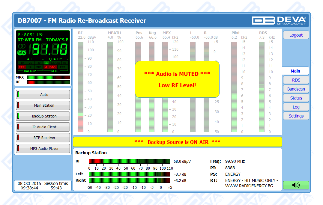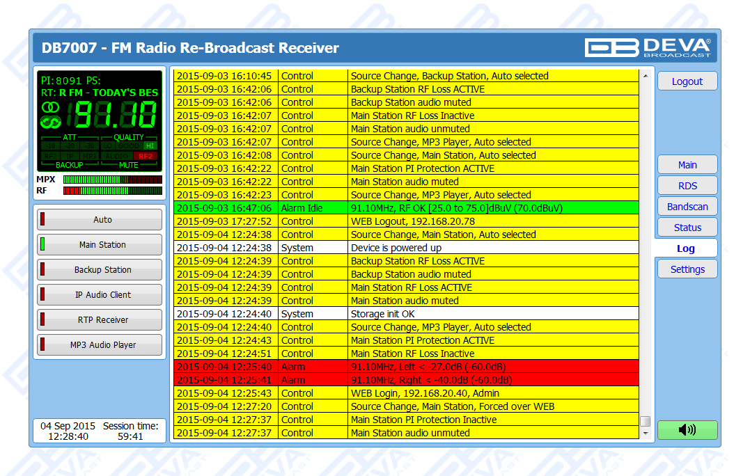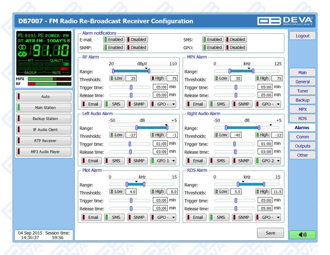 Thanks to the built-in monitoring system, upon audio loss at the inputs, DB7007 will not only notify the maintenance staff, but will also automatically switch to the second back-up RF Station. In case a fail of the second station is detected, DB7007 will shift to the incorporated IP Stream, MP3/AAC back-up audio source player. It is essential that the back-up sources priority is user-defined. The audio files and playlists can be uploaded in the device’s internal memory directly from your PC, via any FTP client. When the signal at the default input is restored, the DB7007 will automatically switch back to it. Depending on your preferences, several types of alarm notifications are utilized - E-mail, SNMP and SMS (via the optional GSM modem).