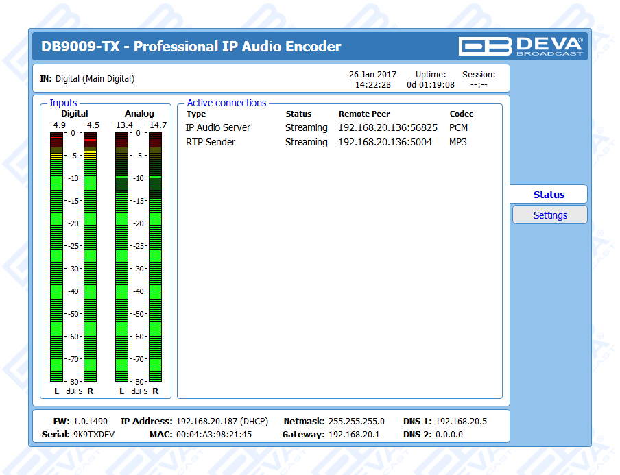 Since DEVA’s products are manufactured to meet the highest standards, the encoding of the audio sources into high quality configurable format, is made in real time by HE-AAC Versions 1 and 2 or MPEG-1 Layer 3. This in combination with the lossless uncompressed PCM stream, unaffected by the variable network conditions, guarantees long distance audio transmission without quality loss.