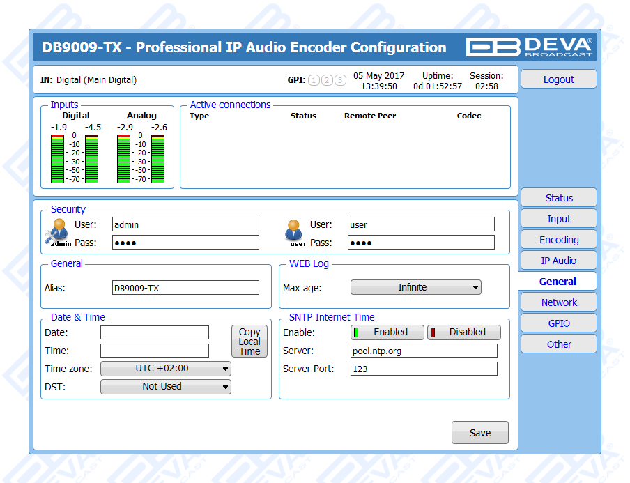 DB9009-TX is a second generation multi protocol Audio over IP Encoder, designed in line with the latest market requirements. Designed to be user friendly in terms of operation, this device is perfect for both inexperienced and professional broadcasters alike. DB9009-TX can work with either analog or digital audio signal. The compressed output signal is directly transmitted over the IP-based networks to one or more compatible IP Audio players or decoders.