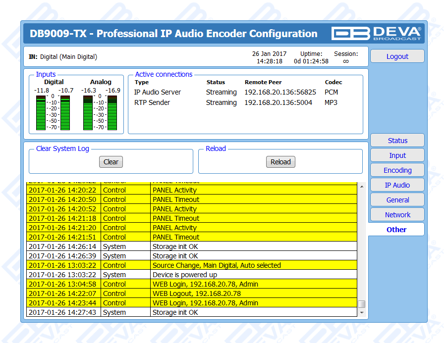 Upon selecting the audio source, the encoded in real time audio will be instantly send to the network. The new and improved DB9009-TX can act simultaneously as an Icecast compatible Server, Icecast source client or Real Time Protocol (RTP) sender. Through the RS-232 port, this device could be easily transformed from an Ethernet to a serial Redirector, enabling quick integration of the existing audio systems to the Internet.