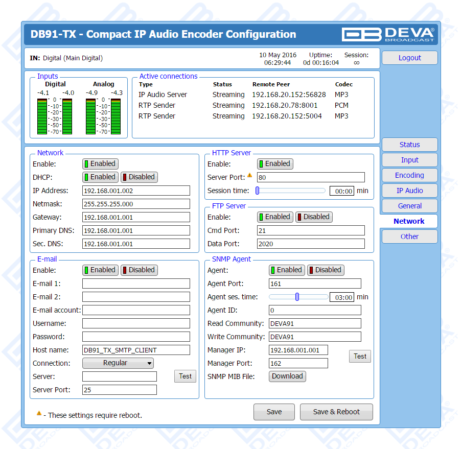 To unit ensures premium broadcasting experience as once the audio source is selected, the encoded in real time audio is immediately transmitted over IP-based networks. The enhanced DB91-TX can act simultaneously as an Icecast/Shoutcast compatible Server, Icecast source client or Real Time Protocol (RTP) sender. The audio stream can be spread over an IP-based network to one or more DB90-RX, DB91-RX or other compatible IP audio decoders. To address the evolving customer needs, the DB91-TX IP Audio Encoder can also send audio to a number of clients simultaneously, provided that a multicast address is being entered as a client address.