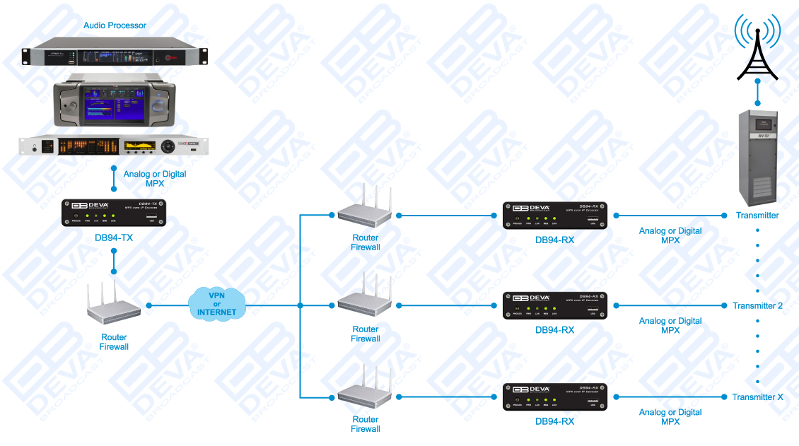 As part of DEVA’s growing portfolio of IP audio solutions, the DB94 is engineered with precision and built using top-tier components, including high-grade ADCs for maximum signal fidelity. It supports both Analog MPX and Digital AES192 inputs, ensuring broad compatibility across different transmitter systems and network architectures. Whether deployed for a single transmitter site or integrated into a larger network, the DB94 delivers consistent, high-quality audio over IP.
