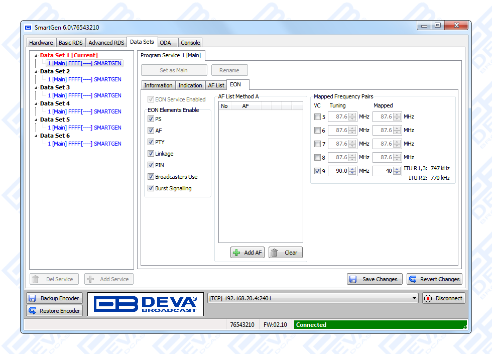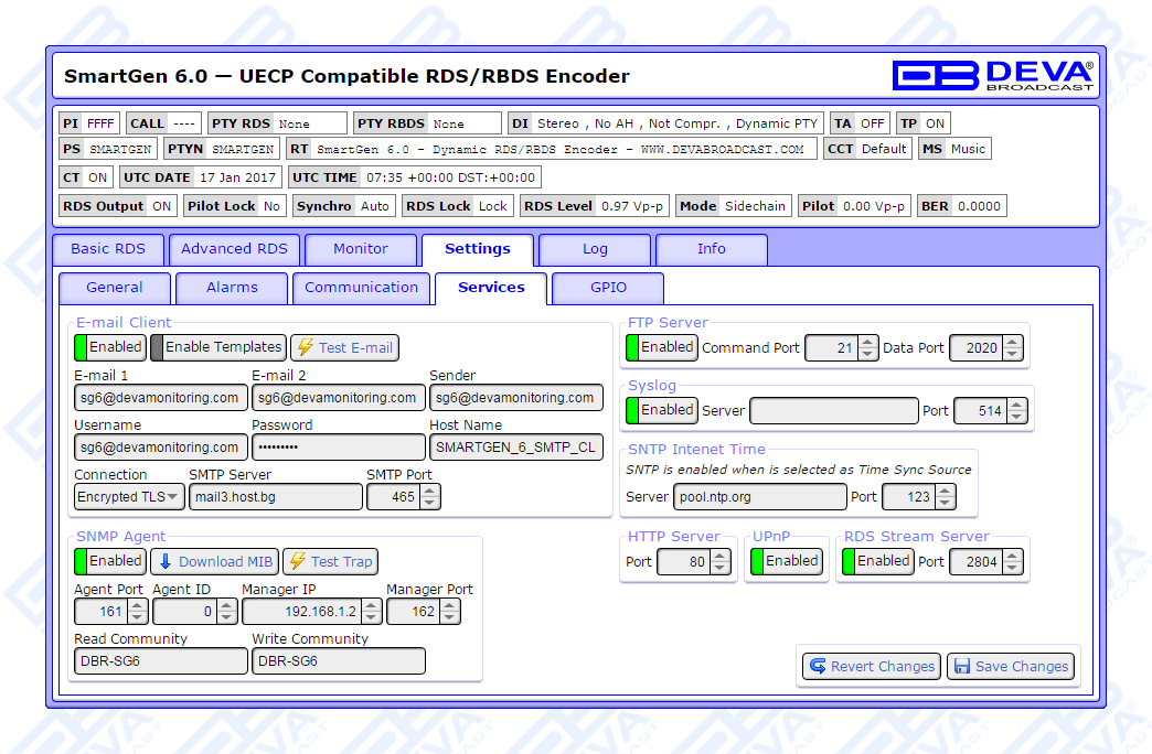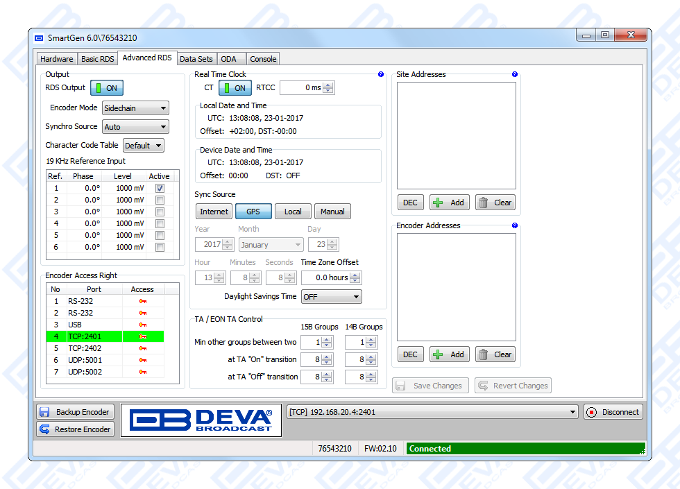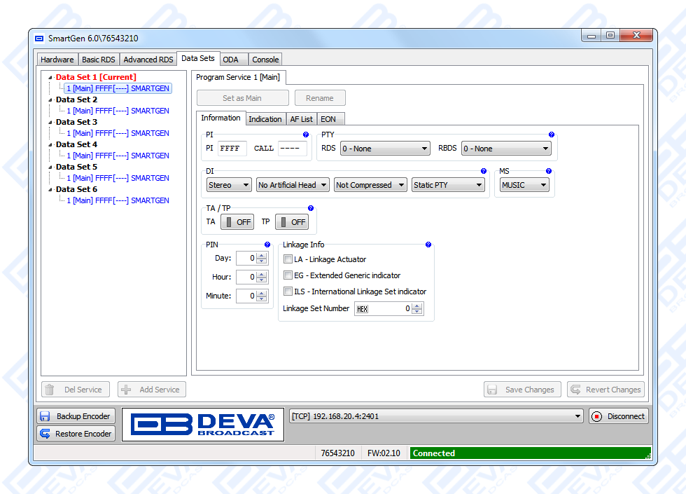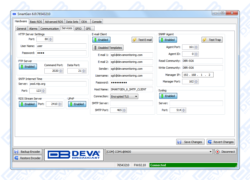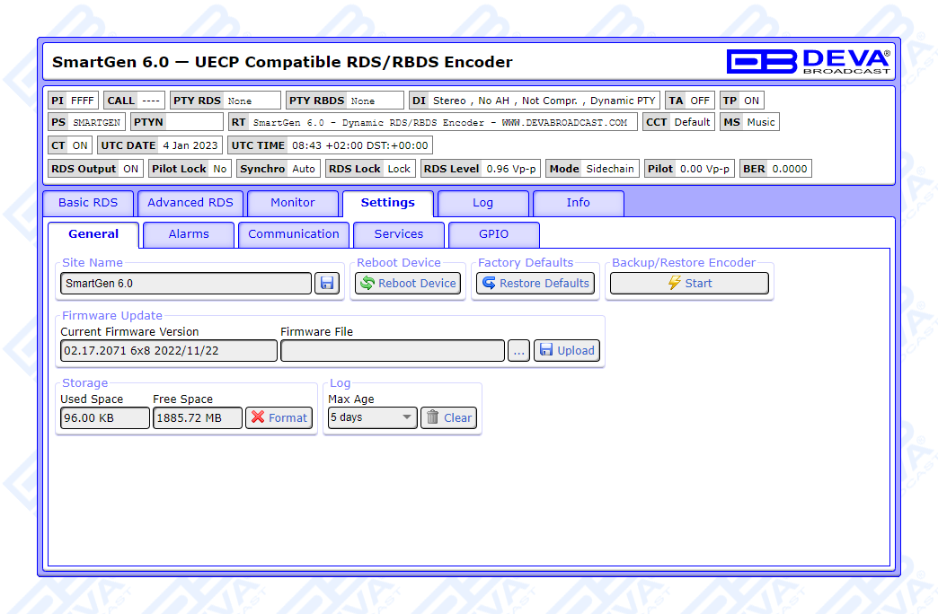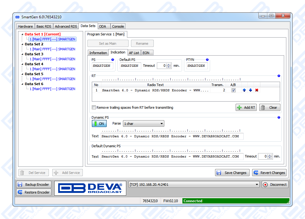 Since all DEVA’s products are manufactured to be user friendly in terms of operation, SmartGen 6 comes with simple and reliable programming software: “SmartGen RDS/RBDS Encoders Manager” and a password protected WEB interface for remote connection.