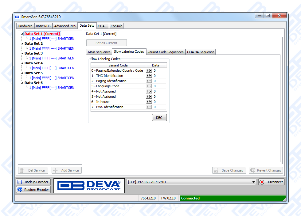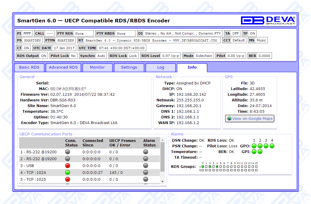 All DEVA Encoders, except for SmartGen Micro and SmartGen 3.1, are fully compliant with EBU SPB490 Ver.7.05. (UECP stands for Universal Encoder Communication Protocol for RDS.)